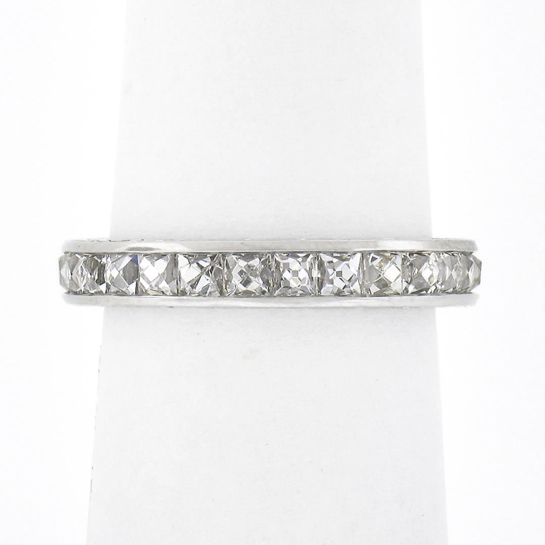 A solid platinum eternity band ring, with 27 square French cut natural diamonds (E/F - VVS2/VS1; 3.0ctw). The ring is size 6.0, weighs a total of 4.13 grams, and measures 3.4mm wide.
