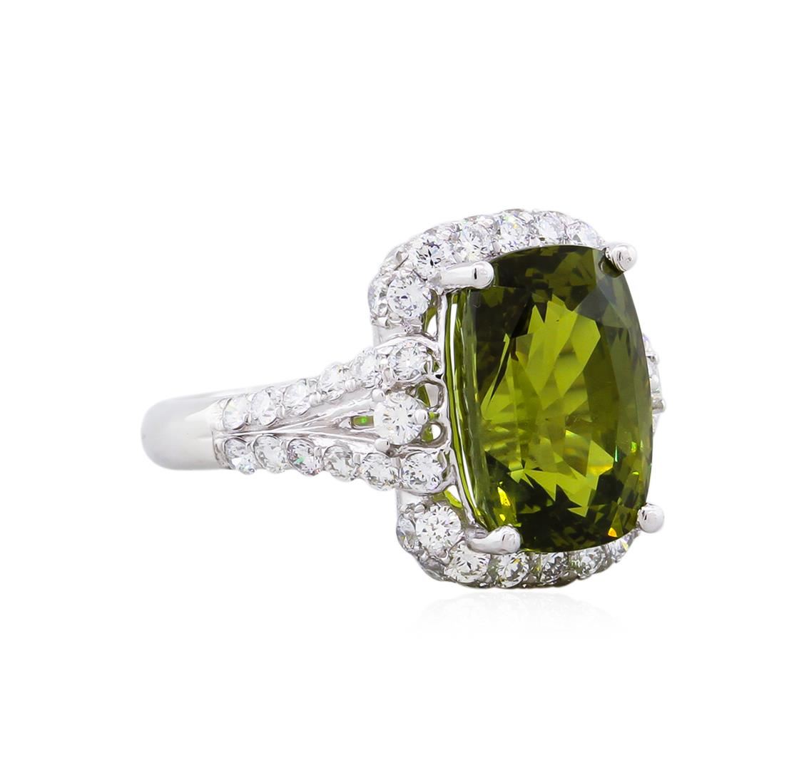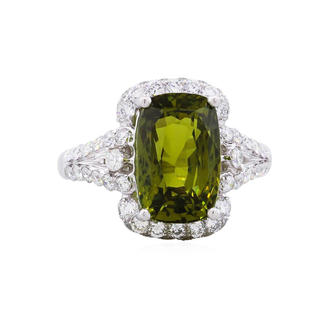 One electronically tested platinum ladies cast alexandrite and diamond ring with a bright polish finish. The featured alexandrite is set within a diamond bezel supported by diamond set split shoulders, completed by a two and one-half millimeter wide band. Trademark is Orianne. Identified with markings of "950". Condition is new, good workmanship. Containing: One prong set cushion modified mixed cut natural alexandrite, measuring 12.13 x 7.85 x 7.30mm, exact weight 6.90ct., type II Clarity is slightly included, medium dark, very slightly grayish, yellowish green color, (GIA yG 6/3) to medium dark, very slightly brownish, brownish yellow, (GIA brY 6/3), cut is good. Transmitting light with a minimum of distortion, transparent. Naturally occurring internal & external characteristics are present. GIA Gemological Report attached. Graded loose prior to setting in the GIA Laboratory, Report #6175625103.The yellowish green color was photographed under 6000K daylight; the brownish yellow color was photographed under 2000K incandescent light, see the photographs to the right.Alexandrite was discovered in the 1830's near the Tokovaya River in the Ural Mountains of Siberian Russia. It later became the national gemstone of Russia. The name "alexandrite" became official in 1842.Alexandrite is a variety of chrysoberyl. It contains both beryllium and chromium. It is the chromium that accounts for the spectacular color change. The color change is the primary qualification for a chrysoberyl to be considered alexandrite. Alexandrite is strongly trichroic. Its color change results in a near-equal transmission of the blue-green and red portions of the spectrum, coupled with strong absorption in the yellow. Today Alexandrite is found in Brazil, India, Madagascar, Myanmar, Russia, Sri Lanka, Tanzania and Zimbabwe.Fifty-Six prong set round brilliant cut diamonds approximate. Total Weight of 56 Stones = 1.13ct. Graded in the setting. Clarity: VS-1 to VS-2. Color: D - E. Total Weight of Colored Stones 6.90ct. Total Weight of Diamonds 1.13ct. Total Weight of Ring 7.49gm. AIG Appraised at $51,365.00.