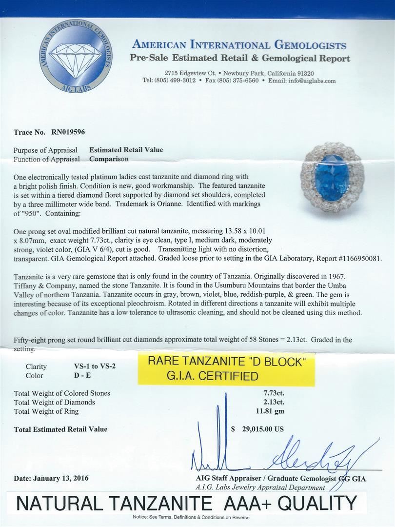 One electronically tested platinum ladies cast tanzanite and diamond ring with a bright polish finish. The featured tanzanite is set within a tiered diamond floret supported by diamond set shoulders, completed by a three millimeter wide band. Trademark is Orianne. Identified with markings of "950". Condition is new, good workmanship. Containing: One prong set oval modified brilliant cut natural tanzanite, measuring 13.58 x 10.01 x 8.07mm, exact weight 7.73ct., clarity is eye clean, type I, medium dark, moderately strong, violet color, (GIA V 6/4), cut is good. Transmitting light with no distortion, transparent. GIA Gemological Report attached. Graded loose prior to setting in the GIA Laboratory, Report #1166950081.Tanzanite is a very rare gemstone that is only found in the country of Tanzania. Originally discovered in 1967. Tiffany & Company, named the stone Tanzanite. It is found in the Usumburu Mountains that border the Umba Valley of northern Tanzania. Tanzanite occurs in gray, brown, violet, blue, reddish-purple, & green. The gem is interesting because of its exceptional pleochroism. Rotated in different directions a tanzanite will exhibit multiple changes of color. Tanzanite has a low tolerance to ultrasonic cleaning, and should not be cleaned using this method.Fifty-Eight prong set round brilliant cut diamonds approximate. Total Weight of 58 Stones = 2.13ct. Graded in the setting. Clarity: VS-1 to VS-2. Color: D - E. Total Weight of Colored Stones 7.73ct. Total Weight of Diamonds 2.13ct. Total Weight of Ring 11.81gm. AIG Appraised at $29,015.00.