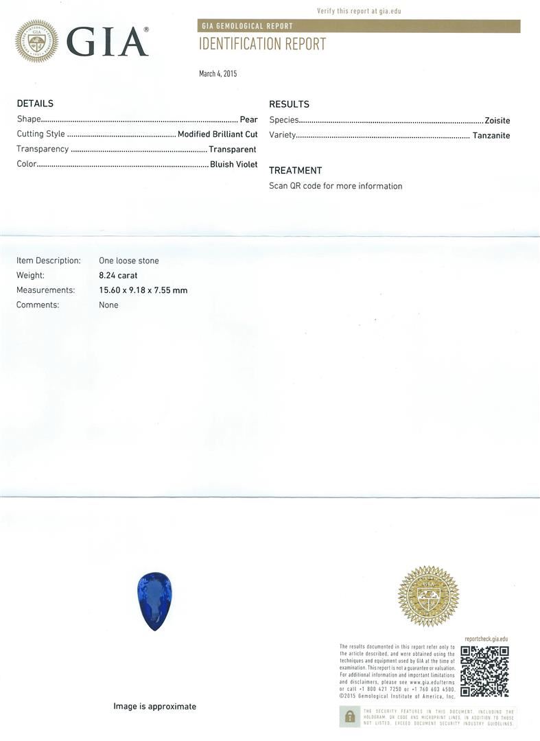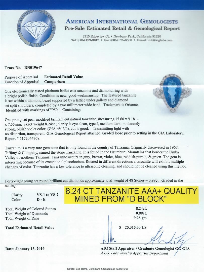 One electronically tested platinum ladies cast tanzanite and diamond ring with a bright polish finish. The featured tanzanite is set within a diamond bezel supported by a lattice under gallery and diamond set split shoulders, completed by a two millimeter wide band. Trademark is Orianne. Identified with markings of "950". Condition is new, good workmanship. Containing: One prong set pear modified brilliant cut natural tanzanite, measuring 15.60 x 9.18 x 7.55mm, exact weight 8.24ct., clarity is eye clean, type I, medium dark, moderately strong, bluish violet color, (GIA bV 6/4), cut is good. Transmitting light with no distortion, transparent. GIA Gemological Report attached. Graded loose prior to setting in the GIA Laboratory, Report # 5172044768.Tanzanite is a very rare gemstone that is only found in the country of Tanzania. Originally discovered in 1967. Tiffany & Company, named the stone Tanzanite. It is found in the Usumburu Mountains that border the Umba Valley of northern Tanzania. Tanzanite occurs in gray, brown, violet, blue, reddish-purple, & green. The gem is interesting because of its exceptional pleochroism. Rotated in different directions a tanzanite will exhibit multiple changes of color. Tanzanite has a low tolerance to ultrasonic cleaning, and should not be cleaned using this method.Forty-Eight prong set round brilliant cut diamonds approximate. Total Weight of 48 Stones = 0.99ct. Graded in the setting. Clarity: VS-1 to VS-2. Color: D - E. Total Weight of Colored Stones 8.24ct. Total Weight of Diamonds 0.99ct. Total Weight of Ring 9.25gm. AIG Appraised at $25,315.00.
