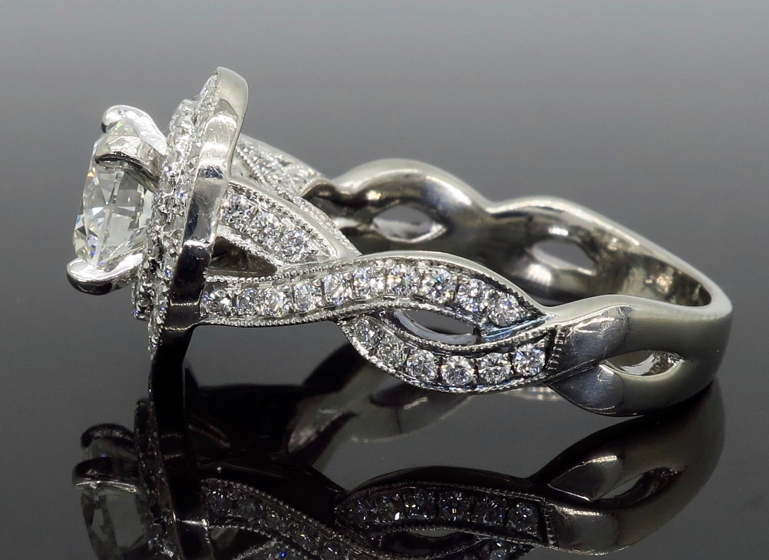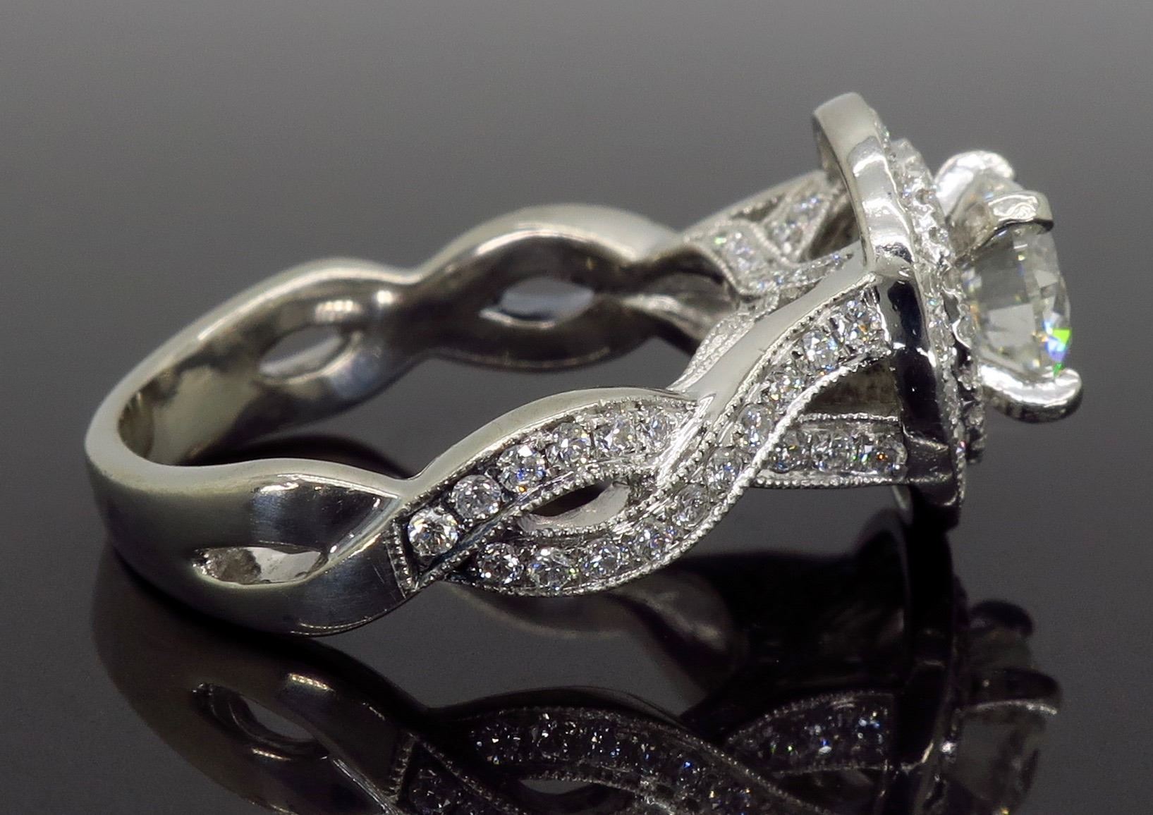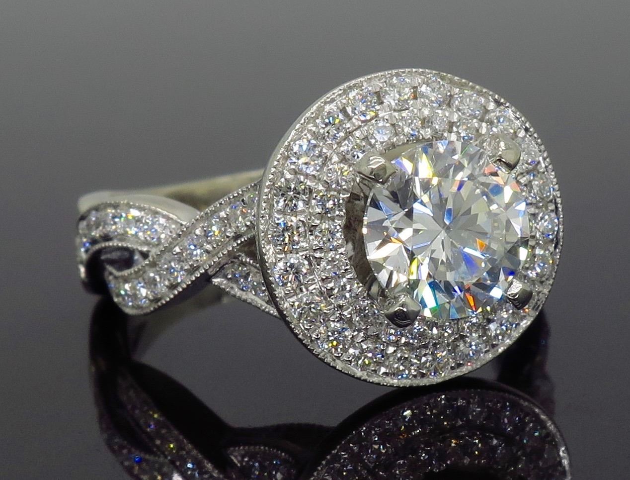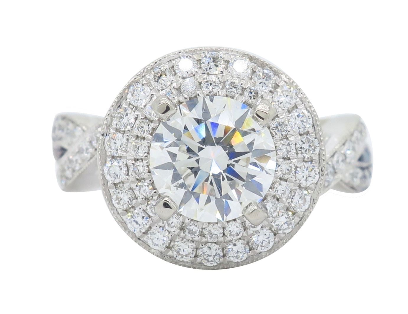 One Platinum GIA Cert 2.00ctw Diamond Ring. (1) GIA Certified round Diamond with a total weight of 1.00cts with a color of G and clarity of SI-1. (102) Round Diamonds with a total weight of 1.00cts. Total weight of this ring is 8.4 grams. Ring size is 5.