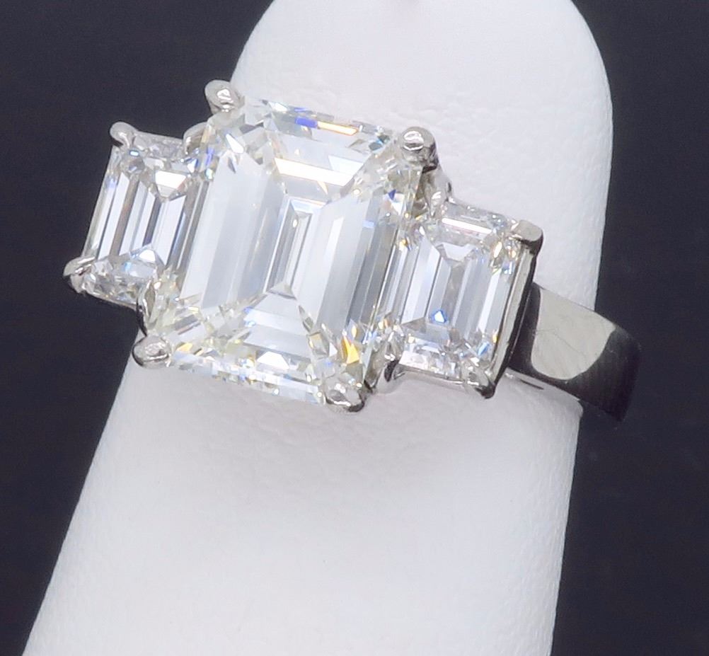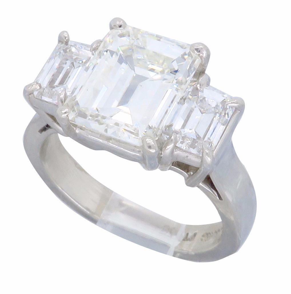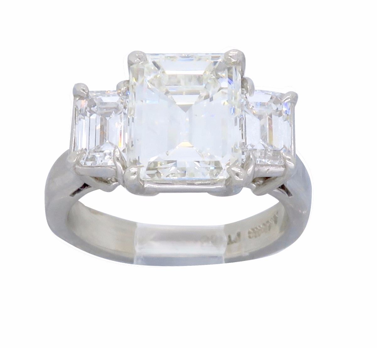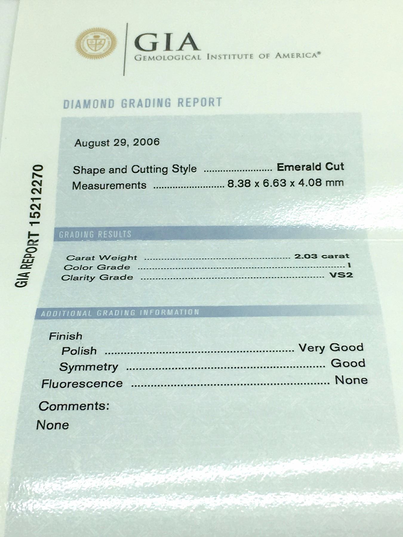 One Platinum GIA Cert 2.63ctw Diamond Ring. (1) GIA Certified Emerald cut Diamond with a total weight of 2.03cts with a color of I and clarity of VS-2. (2) side diamonds with a total weight of 0.60cts. Total weight of this ring is 6.8 grams. Ring size is 3.