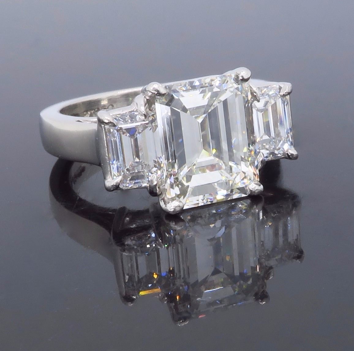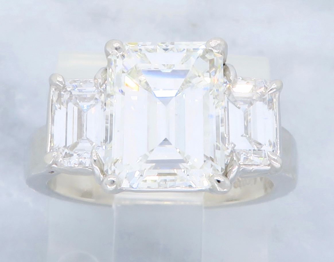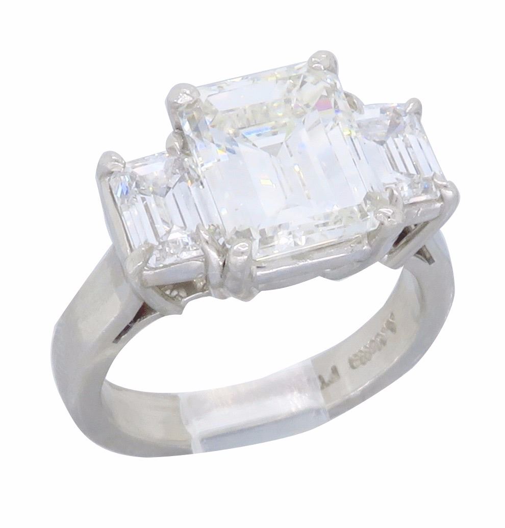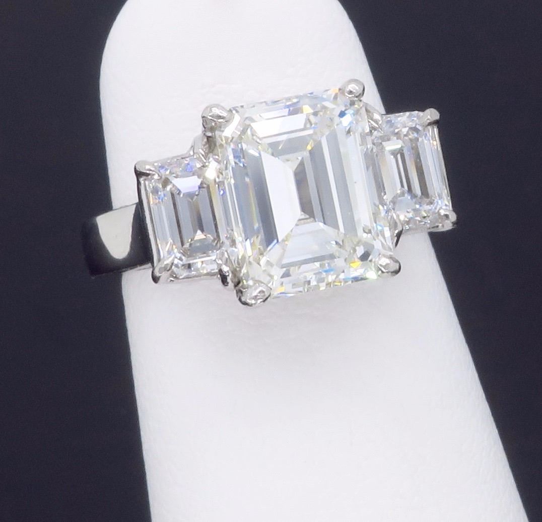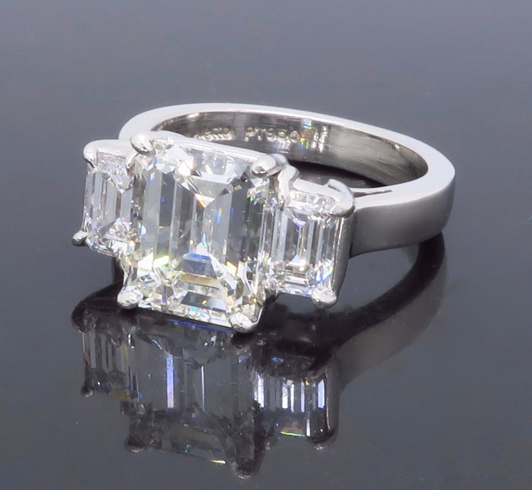 One Platinum GIA Cert 2.63ctw Diamond Ring. (1) GIA Certified Emerald cut Diamond with a total weight of 2.03cts with a color of I and clarity of VS-2. (2) side diamonds with a total weight of 0.60cts. Total weight of this ring is 6.8 grams. Ring size is 3.