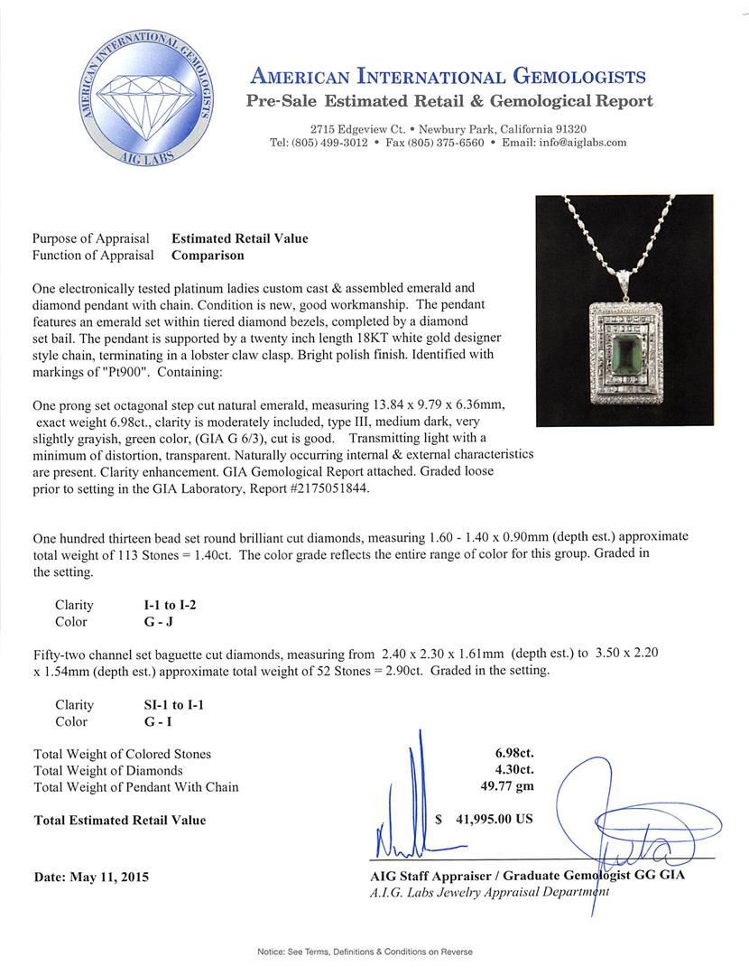 One electronically tested platinum ladies custom cast & assembled emerald and diamond pendant with chain. The pendant features an emerald set within tiered diamond bezels, completed by a diamond set bail. The pendant is supported by a twenty inch length 18KT white gold designer style chain, terminating in a lobster claw clasp. Bright polish finish. Identified with markings of "Pt900". Condition is new, good workmanship. Containing: One prong set octagonal step cut natural emerald, measuring 13.84 x 9.79 x 6.36mm, exact weight 6.98ct., clarity is moderately included, type III, medium dark, very slightly grayish, green color, (GIA G 6/3), cut is good. Transmitting light with a minimum of distortion, transparent. Naturally occurring internal & external characteristics are present. Clarity enhancement. GIA Gemological Report attached. Graded loose prior to setting in the GIA Laboratory, Report #2175051844.One Hundred Thirteen bead set round brilliant cut diamonds, measuring 1.60 - 1.40 x 0.90mm (depth est.) approximate total weight of 113 Stones = 1.40ct. The color grade reflects the entire range of color for this group. Graded in the setting. Clarity: I-1 to I-2. Color: G - J Fifty-Two channel set baguette cut diamonds, measuring from 2.40 x 2.30 x 1.61mm (depth est.) to 3.50 x 2.20 x 1.54mm (depth est.) approximate total weight of 52 Stones = 2.90ct. Graded in the setting. Clarity: SI-1 to I-1. Color: G - I. Total Weight of Colored Stones 6.98ct. Total Weight of Diamonds 4.30ct. AIG Appraised at $41,995.00.