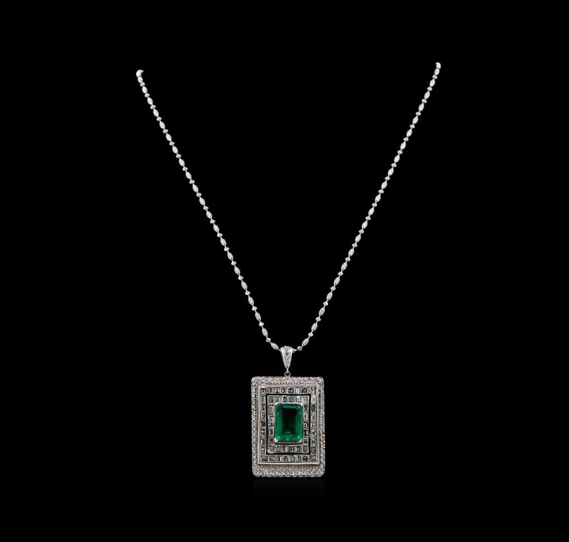 One electronically tested platinum ladies custom cast & assembled emerald and diamond pendant with chain. The pendant features an emerald set within tiered diamond bezels, completed by a diamond set bail. The pendant is supported by a twenty inch length 18KT white gold designer style chain, terminating in a lobster claw clasp. Bright polish finish. Identified with markings of "Pt900". Condition is new, good workmanship. Containing: One prong set octagonal step cut natural emerald, measuring 13.84 x 9.79 x 6.36mm, exact weight 6.98ct., clarity is moderately included, type III, medium dark, very slightly grayish, green color, (GIA G 6/3), cut is good. Transmitting light with a minimum of distortion, transparent. Naturally occurring internal & external characteristics are present. Clarity enhancement. GIA Gemological Report attached. Graded loose prior to setting in the GIA Laboratory, Report #2175051844.One Hundred Thirteen bead set round brilliant cut diamonds, measuring 1.60 - 1.40 x 0.90mm (depth est.) approximate total weight of 113 Stones = 1.40 ct. The color grade reflects the entire range of color for this group. Graded in the setting. Clarity: I-1 to I-2. Color: G - J Fifty-Two channel set baguette cut diamonds, measuring from 2.40 x 2.30 x 1.61mm (depth est.) to 3.50 x 2.20 x 1.54mm (depth est.) approximate total weight of 52 Stones = 2.90 ct. Graded in the setting. Clarity: SI-1 to I-1. Color: G - I. Total Weight of Colored Stones 6.98ct. Total Weight of Diamonds 4.30 ct. AIG Appraised.