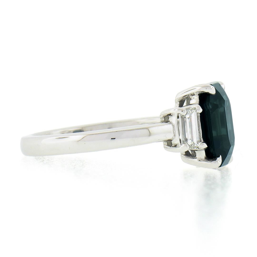 A new solid platinum ring, with 1 GIA graded octagonal cut natural sapphire (3.03ct ), and 2 emerald cut natural diamonds (G/H - VS1/VS2 ; 0.54ctw). The ring is size 6.5, weighs a total of 5.71 grams, and measures 9.2mm wide. Comes with all original relevant certifications.