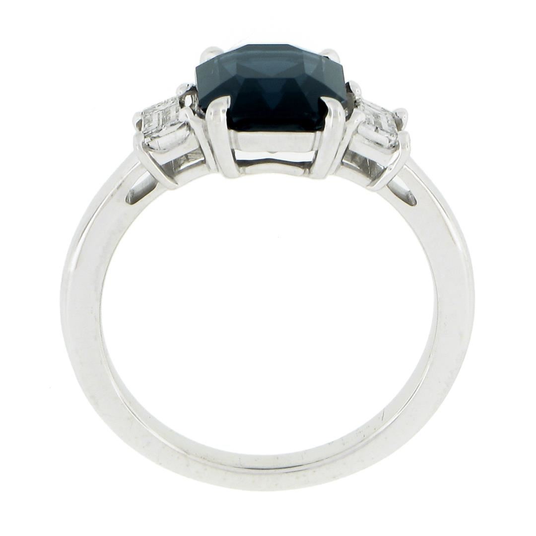 A new solid platinum ring, with 1 GIA graded octagonal cut natural sapphire (3.03ct ), and 2 emerald cut natural diamonds (G/H - VS1/VS2 ; 0.54ctw). The ring is size 6.5, weighs a total of 5.71 grams, and measures 9.2mm wide. Comes with all original relevant certifications.
