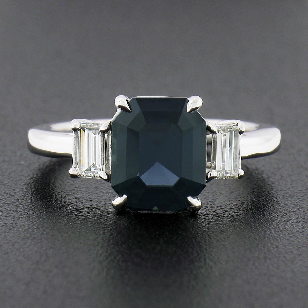 A new solid platinum ring, with 1 GIA graded octagonal cut natural sapphire (3.03ct ), and 2 emerald cut natural diamonds (G/H - VS1/VS2 ; 0.54ctw). The ring is size 6.5, weighs a total of 5.71 grams, and measures 9.2mm wide. Comes with all original relevant certifications.