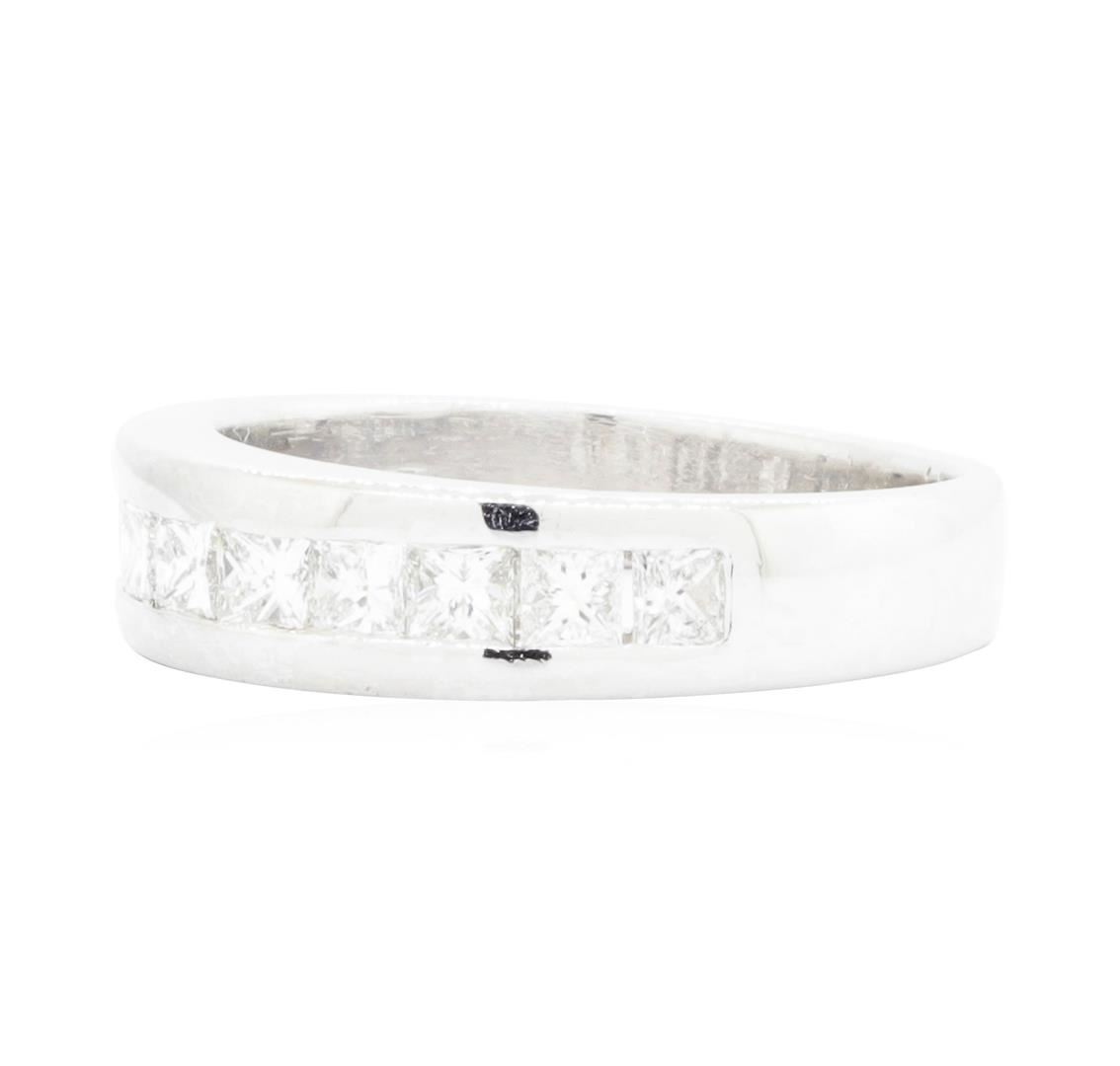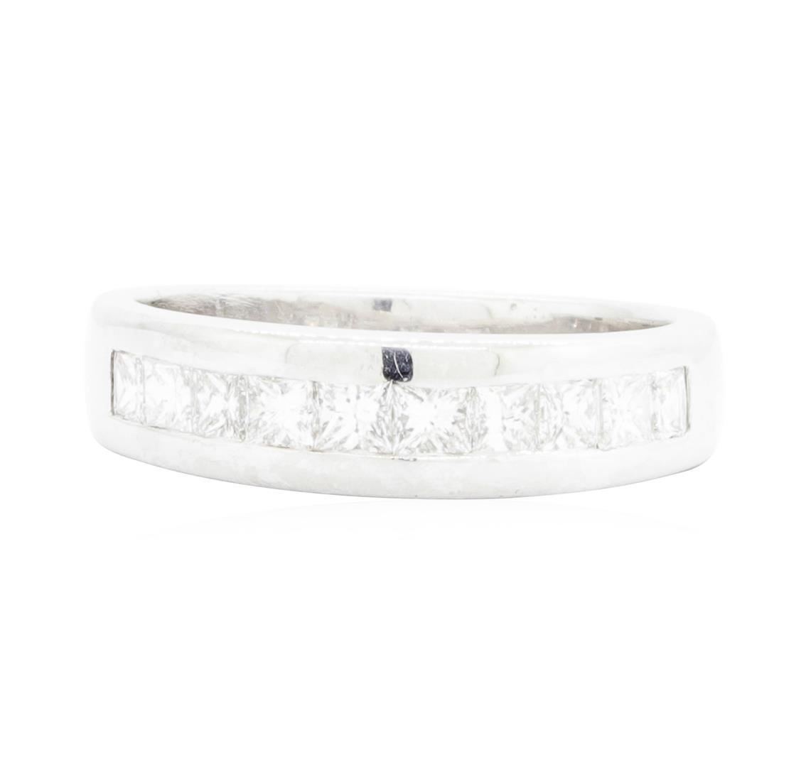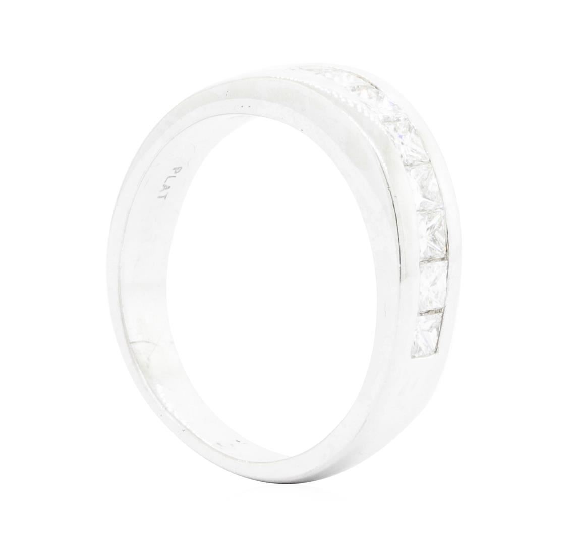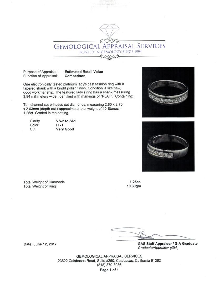 One electronically tested platinum lady's cast fashion ring with a tapered shank with a bright polish finish. The featured lady's ring has a shank measuring 3.94 millimeters wide. Identified with markings of 'PLAT'. Condition is like new, good workmanship. Containing: Ten channel set princess cut diamonds, measuring 2.80 x 2.70 x 2.03mm (depth est.) approximate total weight of 10 Stones = 1.25ct. Graded in the setting. Color H - I Clarity VS-2 to SI-1 Cut Very Good. Total Weight of Diamonds 1.25ct.. Total Weight of Ring 10.30gm GAS Appraised.