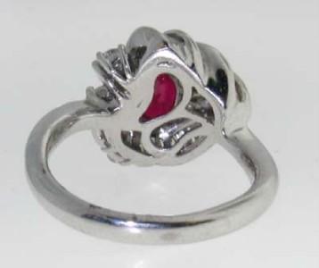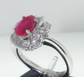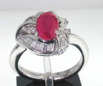 This is a Platinum Lady's Ruby & Diamond Ring. Ring weight: 9.1 grams, Mounting with Platinum. Ruby's specifices: Cut: Oval Shape. Weight: 2.0 cts. color: Medium Red, Clarity: MI. measurement: 8.20 x 5.55 x 3.99 mm. 25 Baguettes & 4 Round Diamond & 3 Marquise, on the side, weight is approximately 0.75 Cts. TWT, G-H color/SI Clarity. The size of the ring is 6.5. This is a beautiful ring!