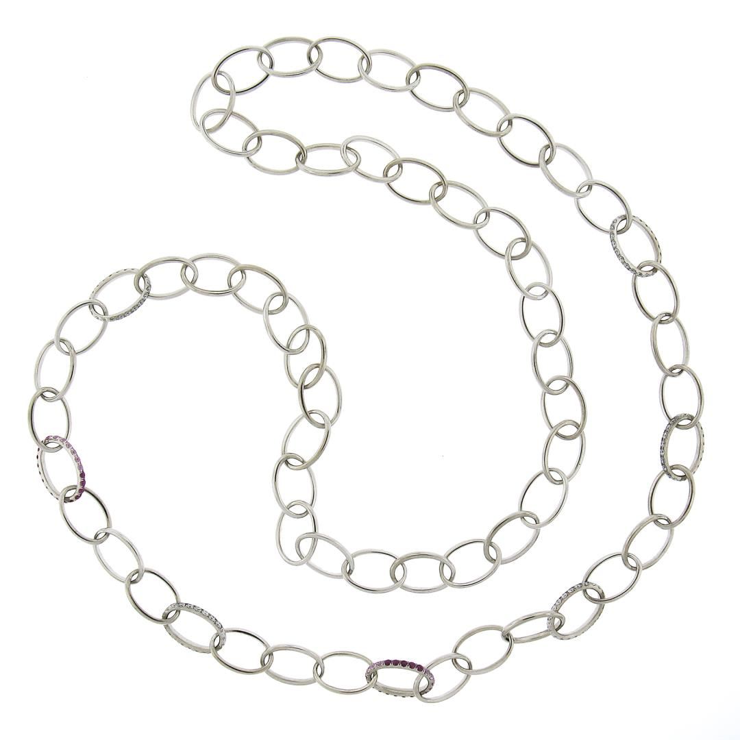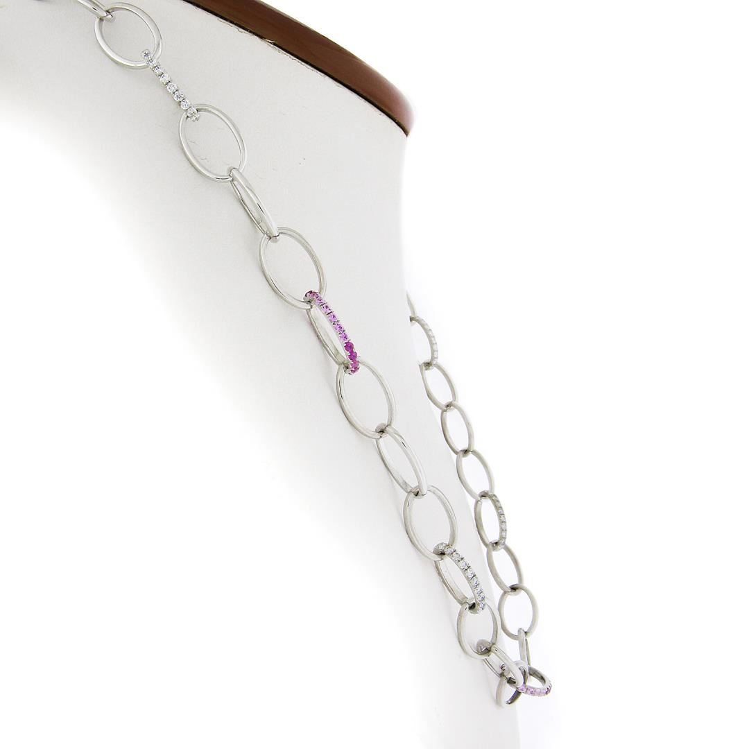 A solid platinum long open link chain necklace, with 110 round cut natural diamonds (F/G - VS1-SI1 w/ Few I1 ; 1.65ctw), and 44 round cut pink stones. It weighs a total of 57.74 grams, measures 9.4mm wide, and measures 29 inches in length.