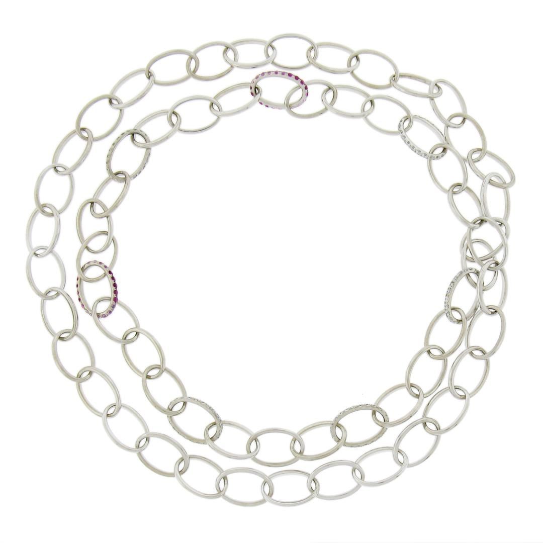 A solid platinum long open link chain necklace, with 110 round cut natural diamonds (F/G - VS1-SI1 w/ Few I1 ; 1.65ctw), and 44 round cut pink stones. It weighs a total of 57.74 grams, measures 9.4mm wide, and measures 29 inches in length.