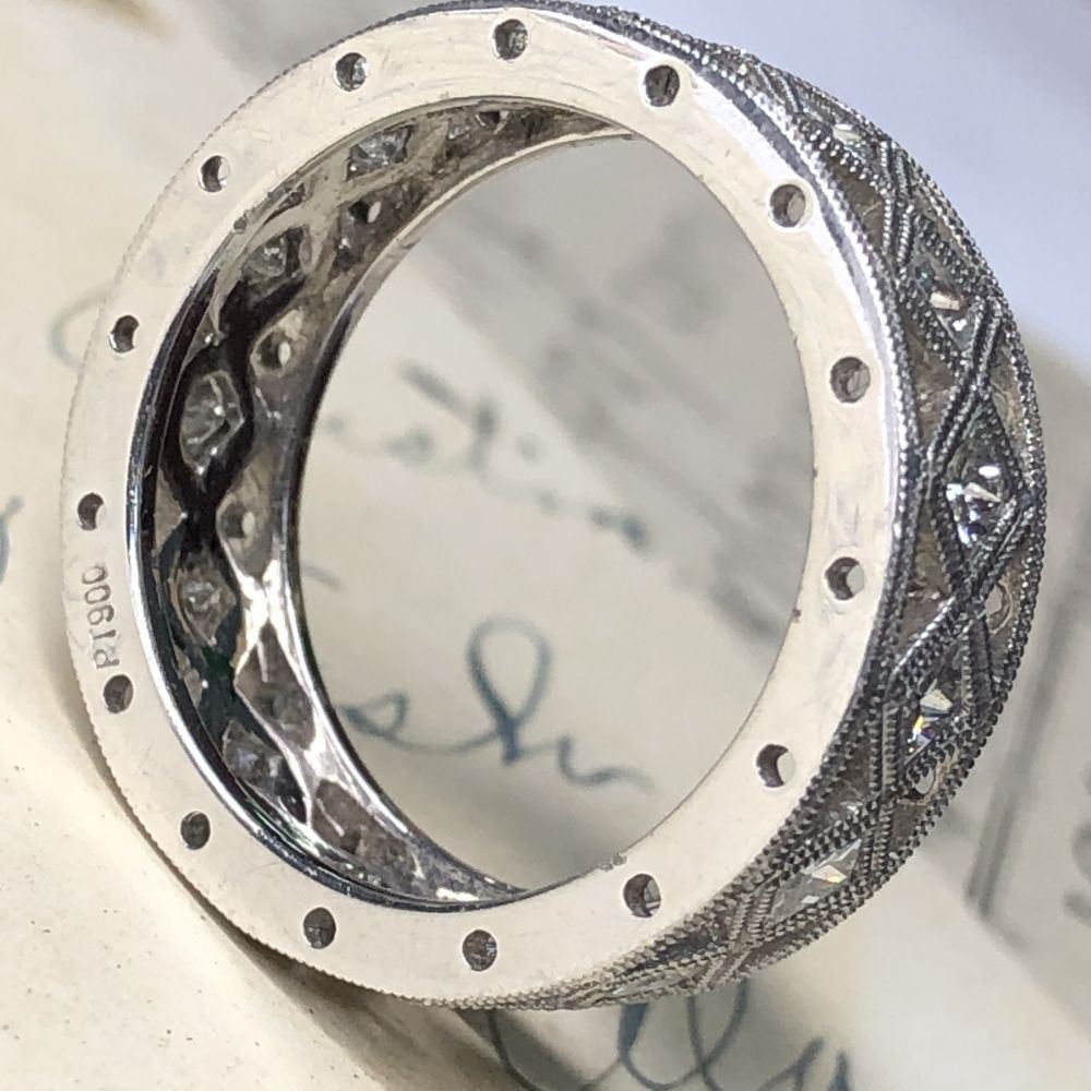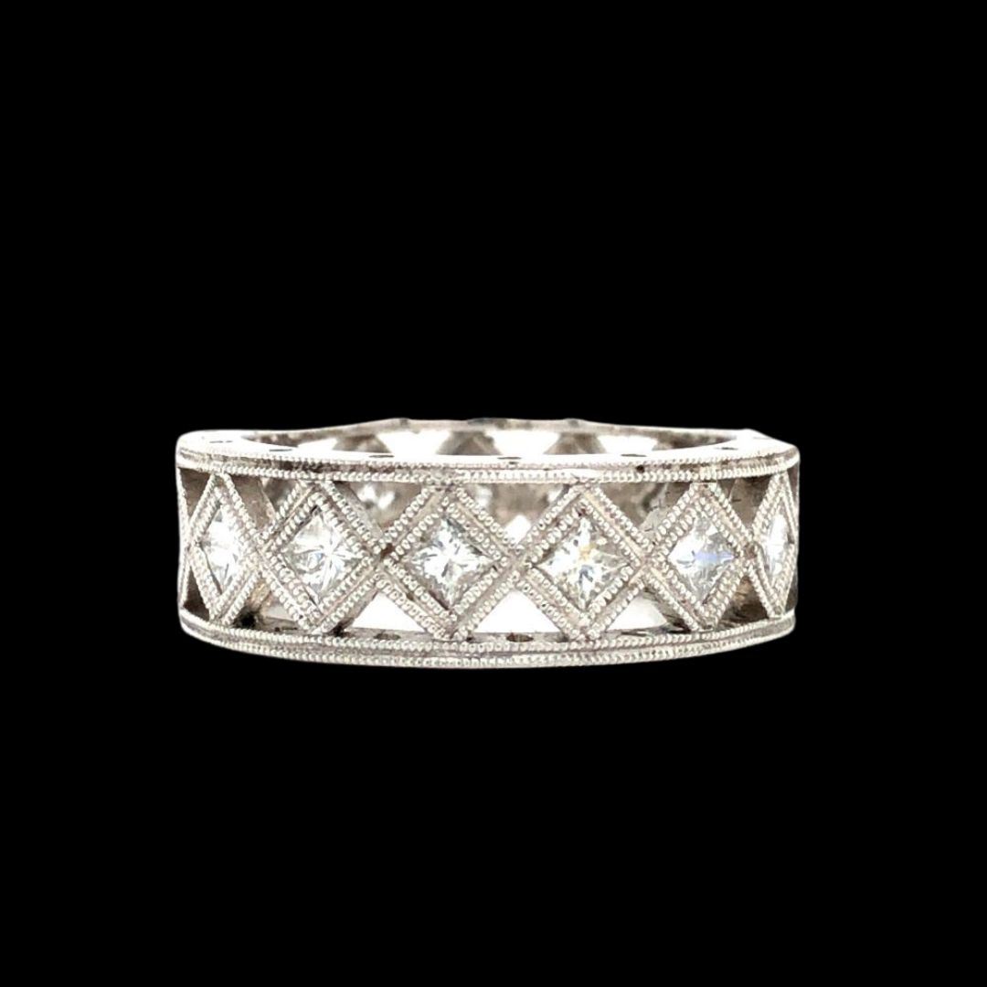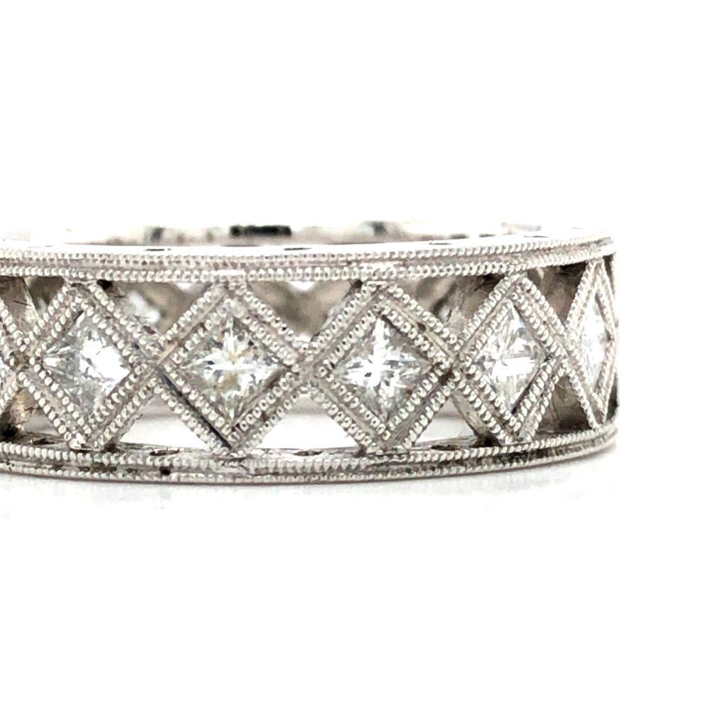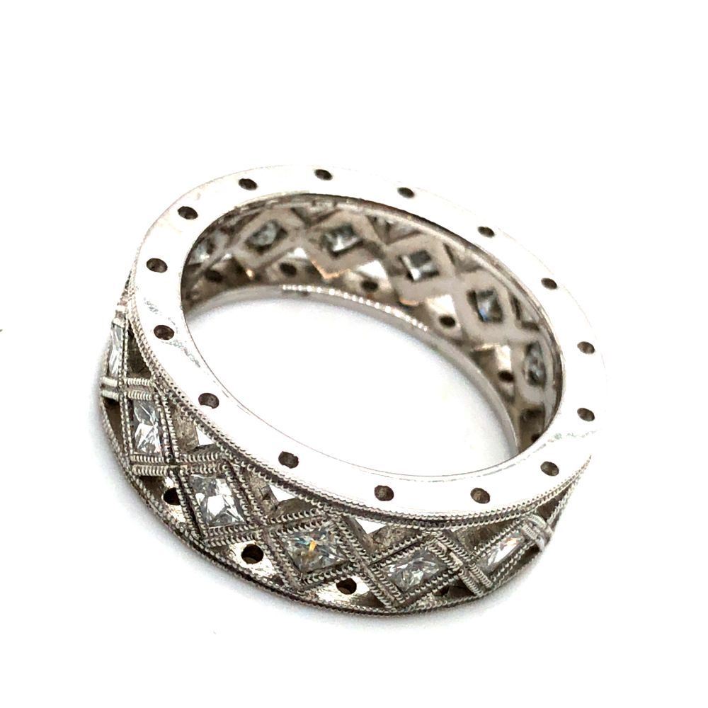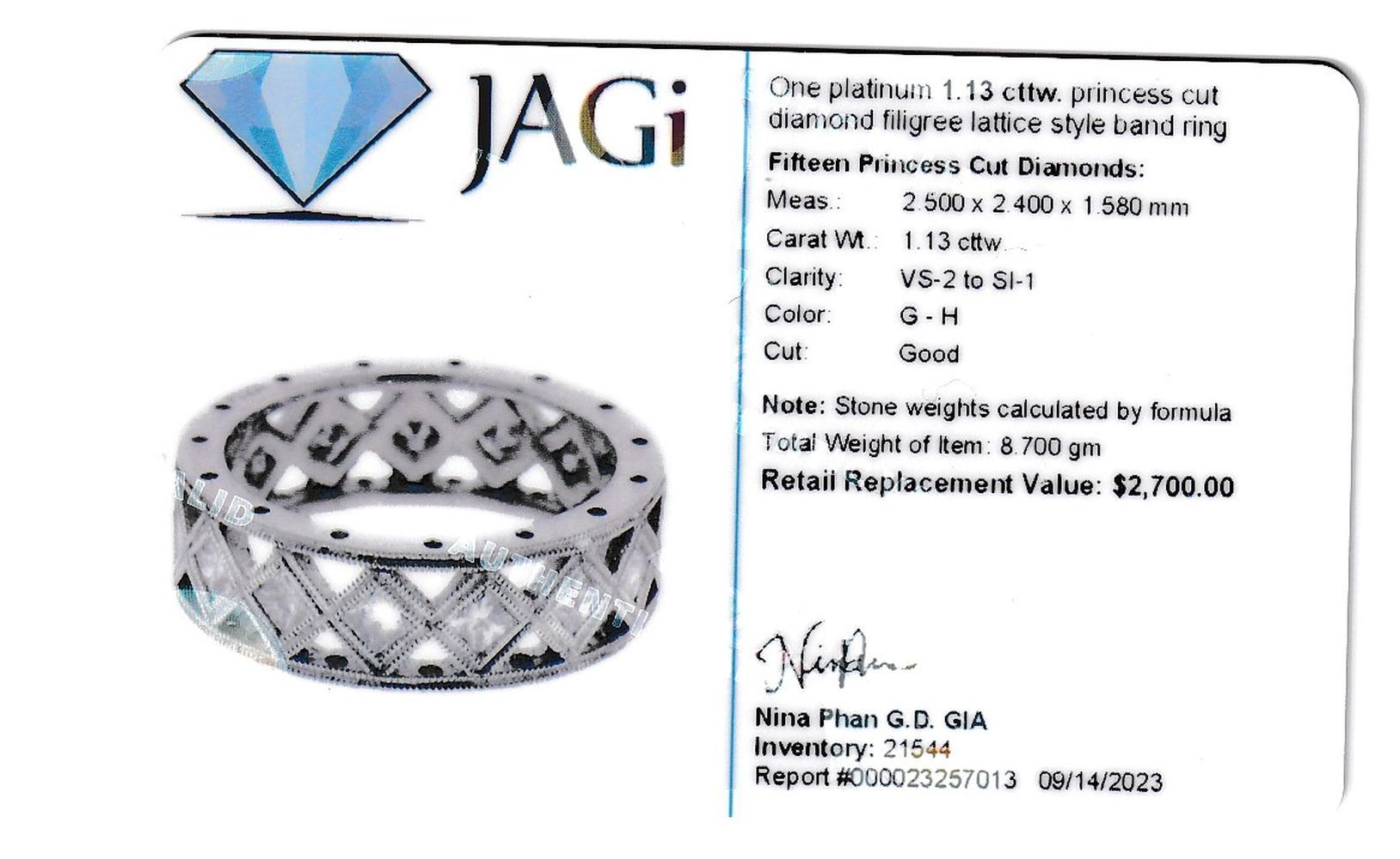 IS96/9 - KNY TITLE DESCRIPTION: Platinum Princess Cut Diamond Wide Eternity Band DESCRIPTION DETAIL: A gorgeous wide band featuring princess cut natural Diamonds set in a criss-cross pattern of milgrained Platinum. OVERALL CONDITION: Excellent, New DIAMONDS: Natural Weight: 1.13 Carats Total Weight Shape: Princess cut Color: G-H Clarity: VS2-SI1 METAL: Platinum (PT950) WEIGHT: 8.7 Grams SIZE: 6.00 APPRAISAL REPORT: This ring is certified and appraised for $2,700.00 estimated retail replacement value by Jewelry Appraisals Gemological Institute (JAGi). ADDITIONAL INFORMATION: An approximate 6.5 mm wide. THIS ITEM IS FROM AN ORDERED LIQUIDATION OF A MAJOR JEWELRY MANUFACTERER'S OVER STOCKED INVENTORY. THIS ITEM WAS PASSED IN A PRIOR AUCTION AND THE RESERVE HAS BEEN LOWERED PRIOR TO BIDDING READ THE DESCRIPTION AND TERMS CAREFULLY This description and condition report is provided for your convenience based on the information provided by the consignor. CAA is not responsible for any discrepancies between this information and other opinions. Buyers Premium: 18% Shipping Billed Separately Payment Due in 5 days All items shipped to registered address - NO EXCEPTIONS IS96/9 - KNY