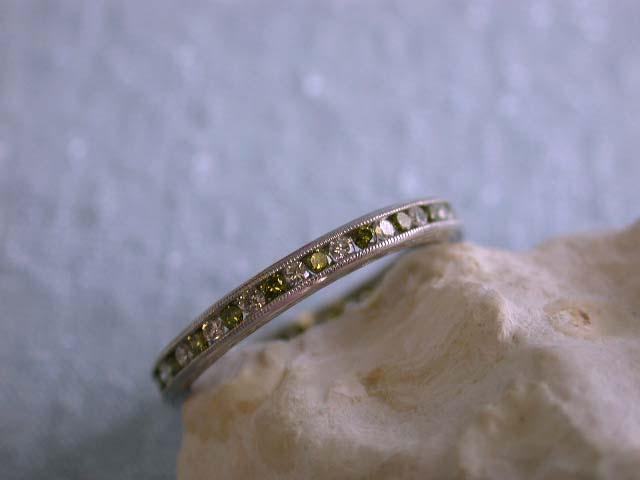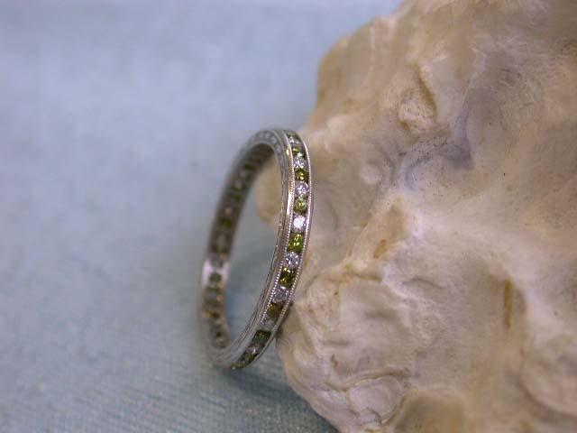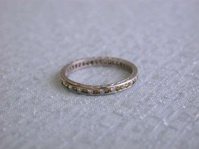 Platinum Ring w/ Diamonds. This is a platinum eternity ring with 0.60 carat White and Green diamonds. The size of this is 6 and the Width is approximately 2.2 mm and weighs 21. grams.