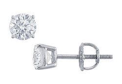 A pair of perfectly matched round diamonds are set in a rich platinum 4-prong mounting. These diamond stud earrings have a total weight (TDW) of 0.75 ct and are available in either screw-back or push-back. The TDW includes the combined weight of both diamonds.