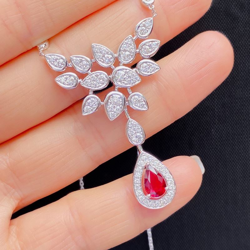 This platinum ruby teardrop necklace features an elegant teardrop design centered with a vivid red ruby that radiates passion and sophistication. Surrounded by brilliant diamonds that enhance its luster, the piece combines timeless beauty with refined craftsmanship. The smooth platinum setting adds a touch of modern luxury, making it a perfect choice for women who appreciate elegance and confidence.R:1.13ct d:1.532ct.Note: Comes with an AIGS certificate.