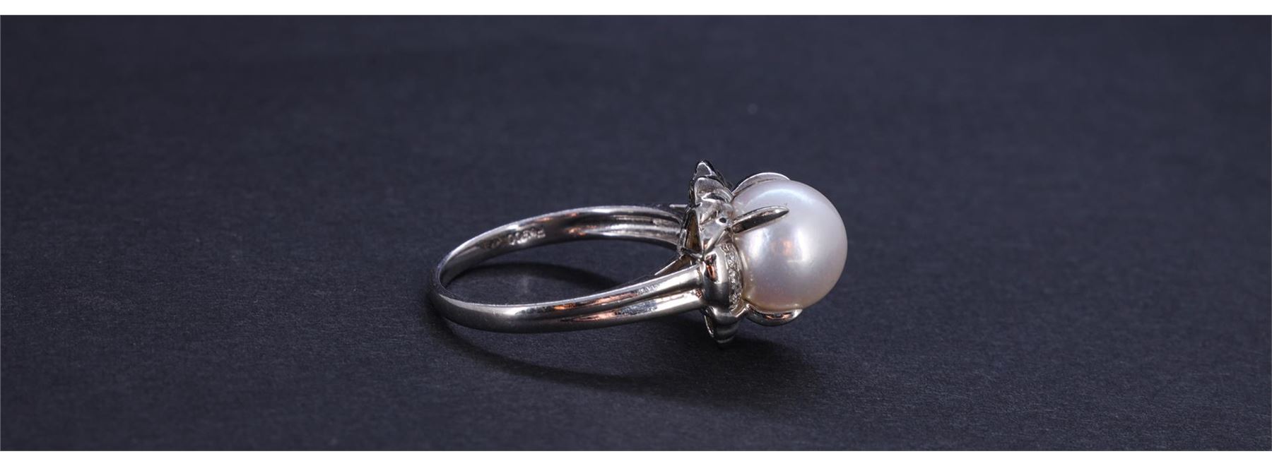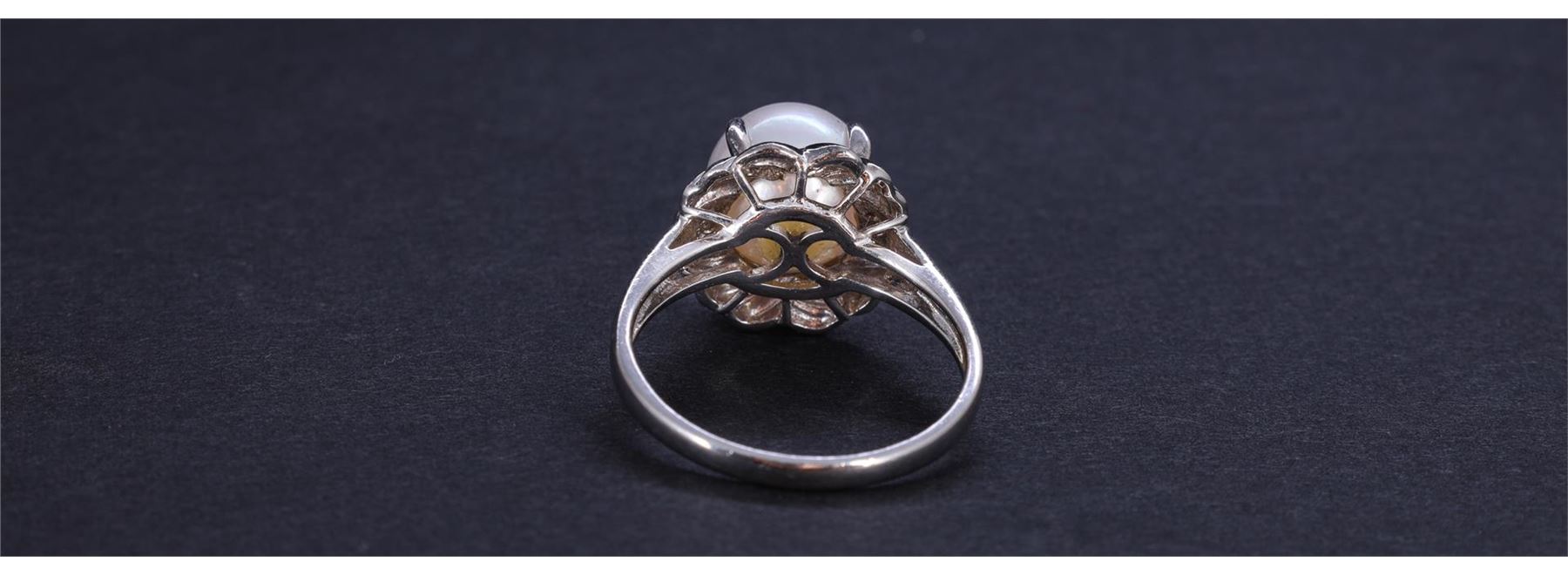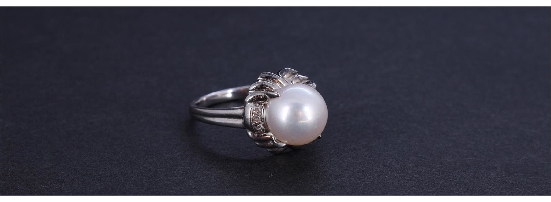 A platinum ring set with South Sea round pearl measuring approximately 9mm in diameter with diamond accents to shoulders, the interior of the ring marked Pt900; gross weight 5.5 g, size 6 1/2