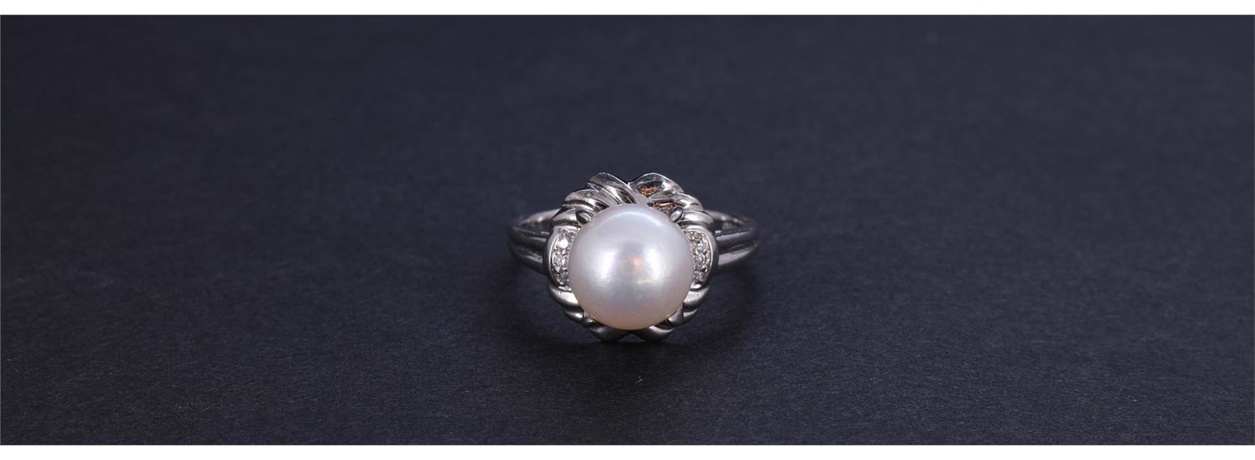 A platinum ring set with South Sea round pearl measuring approximately 9mm in diameter with diamond accents to shoulders, the interior of the ring marked Pt900; gross weight 5.5 g, size 6 1/2