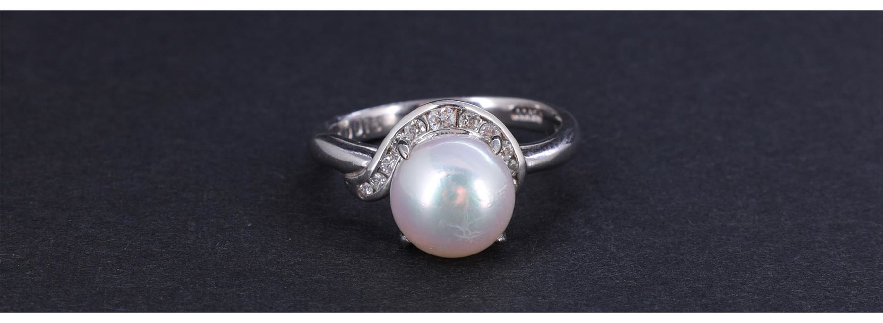 A platinum ring set with South Sea round pearl measuring approximately 9mm surrounded by approximately .16 carats of diamond accents, the interior of the ring marked D0.16 Pt900; gross weight 5.1 g, size 5 3/4