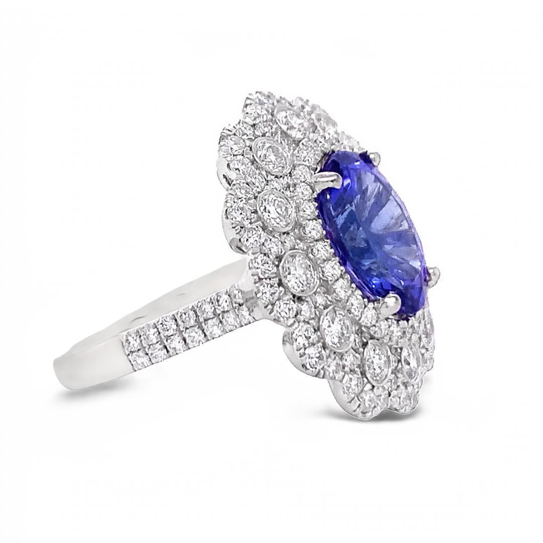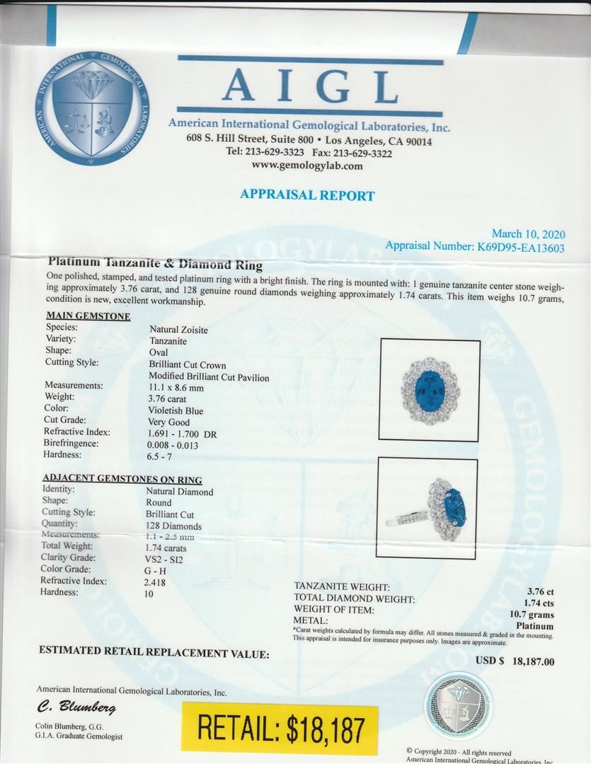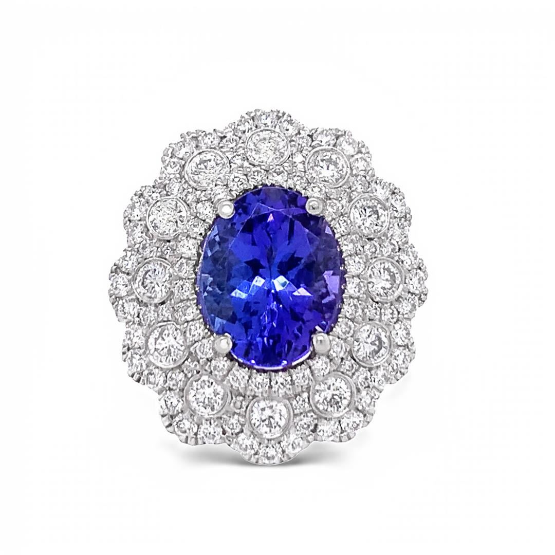 Platinum Tanzanite Ring 3.76ct. Please see Photos and Description for all available information. This ring is inspired by Belle-Époque style, a late 19th-century art movement that celebrated the beauty of the female form. Its scallop design features a 3.76-carat tanzanite center stone, surrounded by a halo of round diamonds. Set in platinum, it’s a timeless piece that will never go out of style.