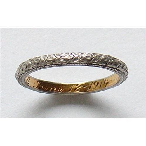 Late Belle Époque wedding band. The platinum outside features repeating orange blossom motifs with finely delineated rope borders. Orange blossoms signify both purity and fruitfulness and are traditionally associated with weddings. The gold interior is inscribed "June 18-1914 MFT to PGL" and is also marked with the