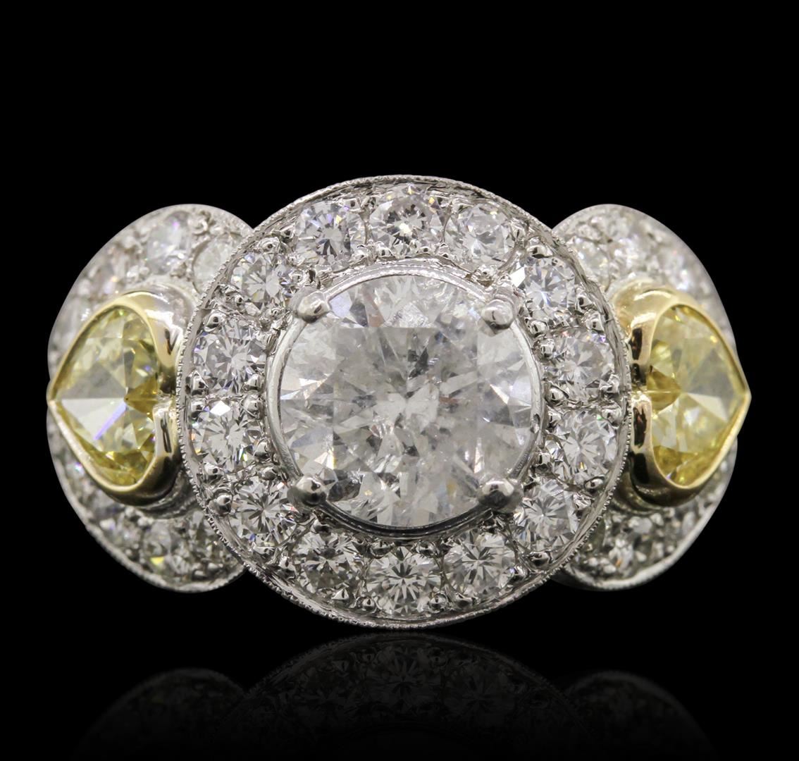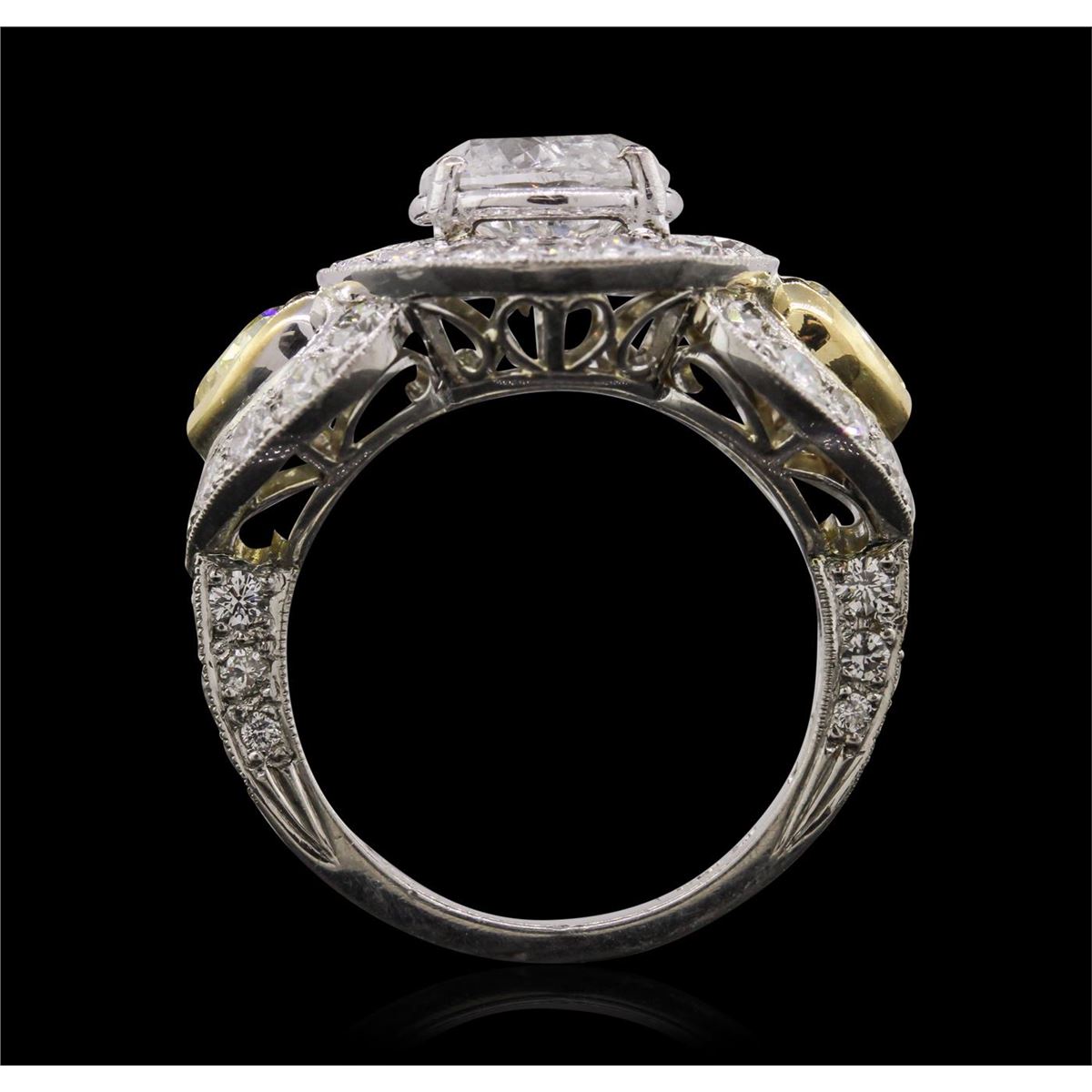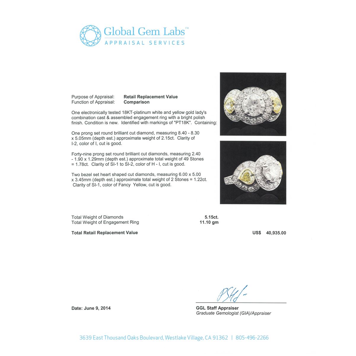 One electronically tested 18KT-platinum white and yellow gold Ladies combination cast & assembled engagement ring with a bright polish finish. Condition is new. Identified with markings of "PT18K". Containing: One prong set round brilliant cut diamond, measuring 8.40 - 8.30 x 5.05mm (depth est.) approximate weight of 2.15ct. Clarity: I-2. Color: I, Cut is Good. Forty-Nine prong set round brilliant cut diamonds, measuring 2.40 - 1.90 x 1.29mm (depth est.) approximate. Total Weight of 49 Stones = 1.78ct. Clarity: SI-1 to SI-2. Color: H - I, Cut is Good. Two bezel set heart shaped cut diamonds, measuring 6.00 x 5.00 x 3.45mm (depth est.) approximate. Total Weight of 2 Stones = 1.22ct. Clarity: SI-1, Cut is Good. Total Weight of Diamonds 5.15ct. Total Weight of Engagement Ring 11.10 grams. GGL Appraised at $40,935.00.