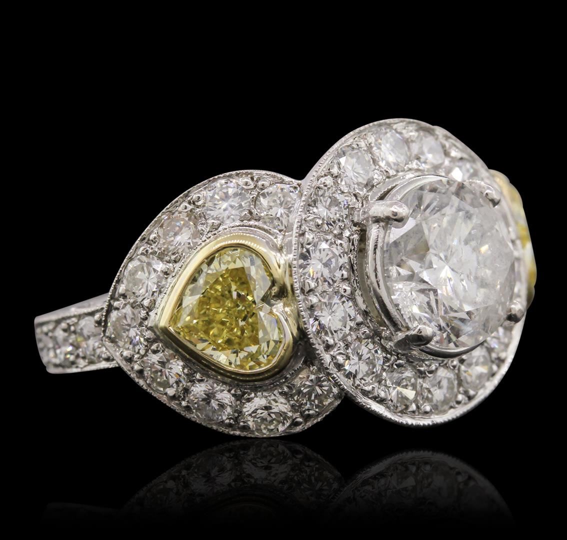 One electronically tested 18KT-platinum white and yellow gold Ladies combination cast & assembled engagement ring with a bright polish finish. Condition is new. Identified with markings of "PT18K". Containing: One prong set round brilliant cut diamond, measuring 8.40 - 8.30 x 5.05mm (depth est.) approximate weight of 2.15ct. Clarity: I-2. Color: I, Cut is Good. Forty-Nine prong set round brilliant cut diamonds, measuring 2.40 - 1.90 x 1.29mm (depth est.) approximate. Total Weight of 49 Stones = 1.78ct. Clarity: SI-1 to SI-2. Color: H - I, Cut is Good. Two bezel set heart shaped cut diamonds, measuring 6.00 x 5.00 x 3.45mm (depth est.) approximate. Total Weight of 2 Stones = 1.22ct. Clarity: SI-1, Cut is Good. Total Weight of Diamonds 5.15ct. Total Weight of Engagement Ring 11.10 grams. GGL Appraised at $40,935.00.