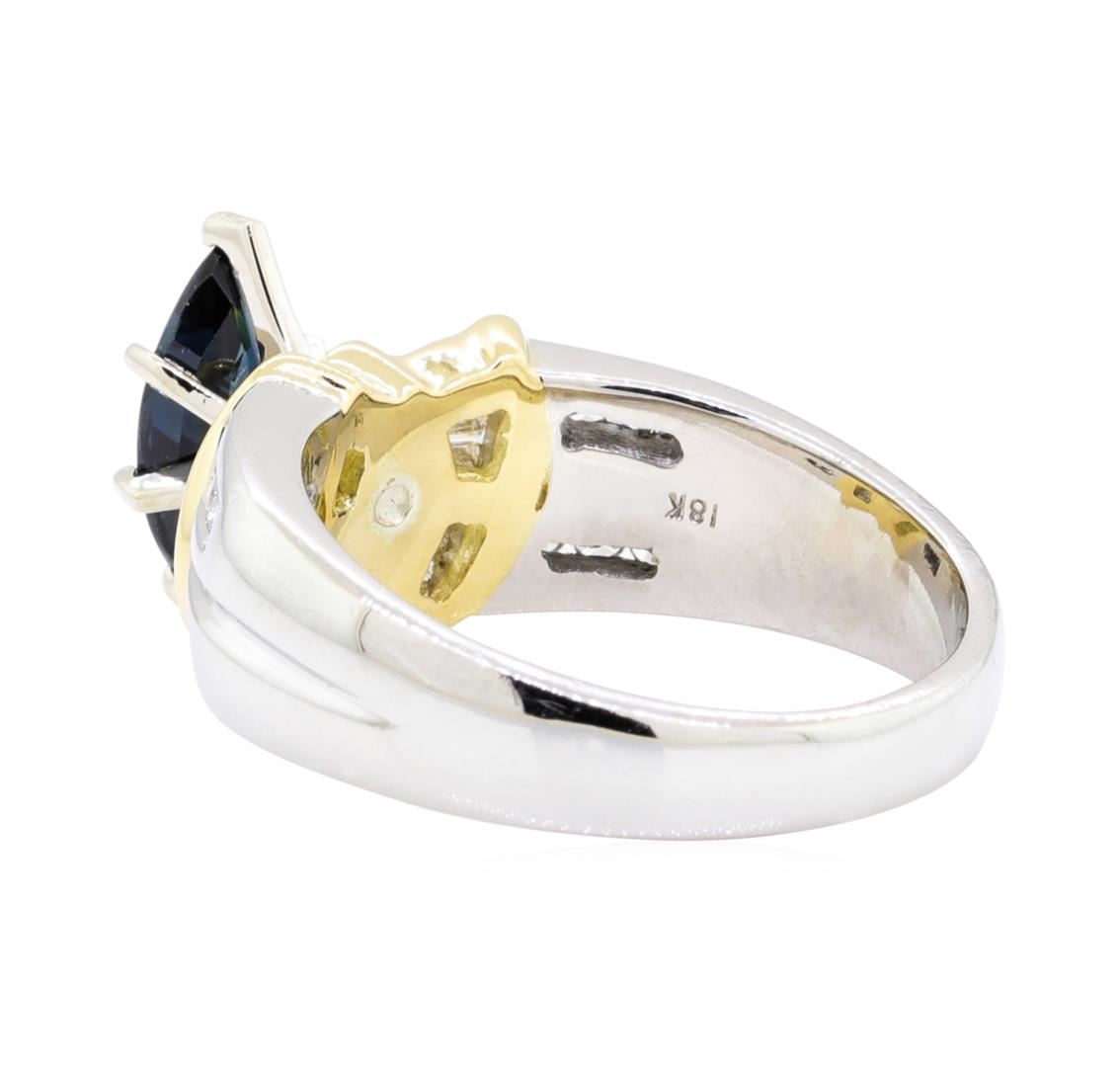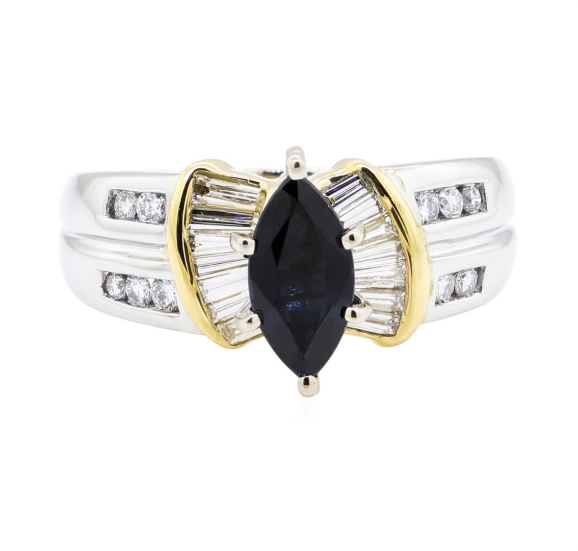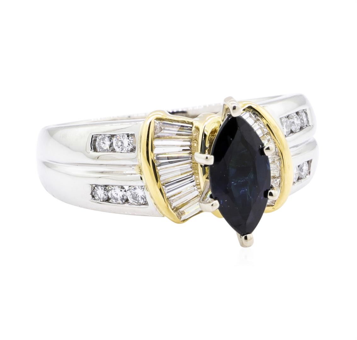 One electronically tested 18KT-platinum yellow gold lady's combination cast & assembled fashion ring with a tapered shank with a bright polish finish. The featured lady's ring has a shank measuring 3.46 millimeters wide. Identified with markings of '18K / PLAT'. Condition is like new, good workmanship. Containing: One prong set marquise modified mixed cut natural blue sapphire, measuring 10.00 x 5.08 x 3.30mm, (depth est.) 5%. bulge factor, approximate weight of 1.35ct., clarity is slightly included, dark, very slightly grayish, very slightly greenish blue color, (GIA vslgB 7/3), cut is good. Transmitting light with a minimum of distortion, transparent. Colored gemstones are presumed to have been subjected to commonly used enhancement processes. Graded in the setting. Fourteen channel set baguette cut (tapered) diamonds, measuring from 2.25 x 1.00 x 0.85mm (depth est.) to 3.50 x 1.20 x 1.02mm (depth est.) approximate total weight of 14 Stones = 0.40ct. Graded in the setting. Color G - H Clarity VS-1 to SI-1 Cut Very Good Ten channel set round brilliant cut diamonds, measuring 1.80 - 1.60 x 1.05mm (depth est.) approximate total weight of 10 Stones = 0.20ct. Graded in the setting. Color G - H Clarity VS-1 to VS-2 Cut Very Good. Total Weight of Colored Stones 1.35ct. Total Weight of Diamonds 0.60ct. Total Weight of Ring 14.30gm. GAS Appraised.