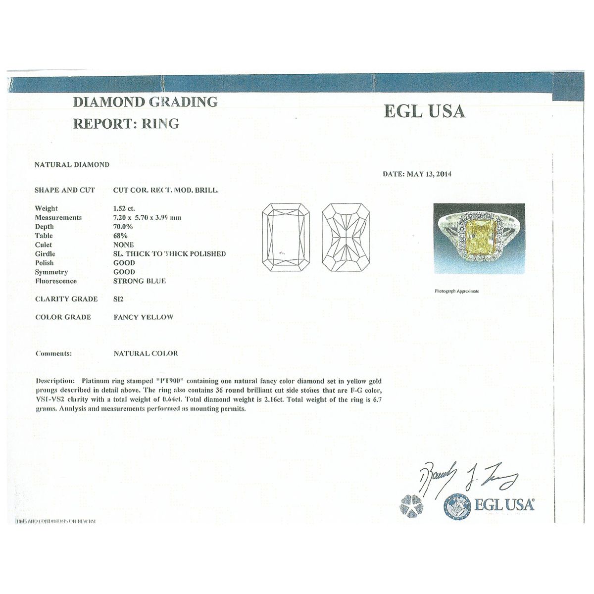 One electronically tested platinum and 18KT yellow gold ladies cast diamond ring with a bright polish finish. The featured diamond is set within an 18KT yellow gold basket and placed within a diamond bezel supported by diamond set split shoulders, completed by a two and one-half millimeter wide band. Identified with markings of "PT900". Condition is new, good workmanship. Containing: One prong set radiant shaped cut diamond, measuring 7.20 x 5.70 x 3.99mm, 6.00.%. GTCF approximate weight of 1.52ct with a strong blue fluorescence. EGL Report attached. Graded in the EGL Laboratory Report #US 69034404D. Clarity: SI-2. Depth: 70.0%. Table 68.0%. Thirty-Six prong set round brilliant cut diamonds, measuring 1.60 - 1.30 x 0.87mm (depth est.) approximate total weight of 36 Stones = 0.64ct. EGL Report attached. Graded in the EGL Laboratory Report #US 69034404D. Clarity: VS-1 to VS-2. Color: F - G. Total Weight of Diamonds 2.16ct. Total Weight of Ring 6.70g. AIGAppraised at $18,375.00.