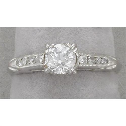 Lovely platinum and diamond ring, circa 1947. The central diamond is an old european-cut estimated to weigh just over 1/2 carat, flanked by eight single-cut diamonds estimated to total about .15 carat. It is a size 7 and weighs 3.2 grams.