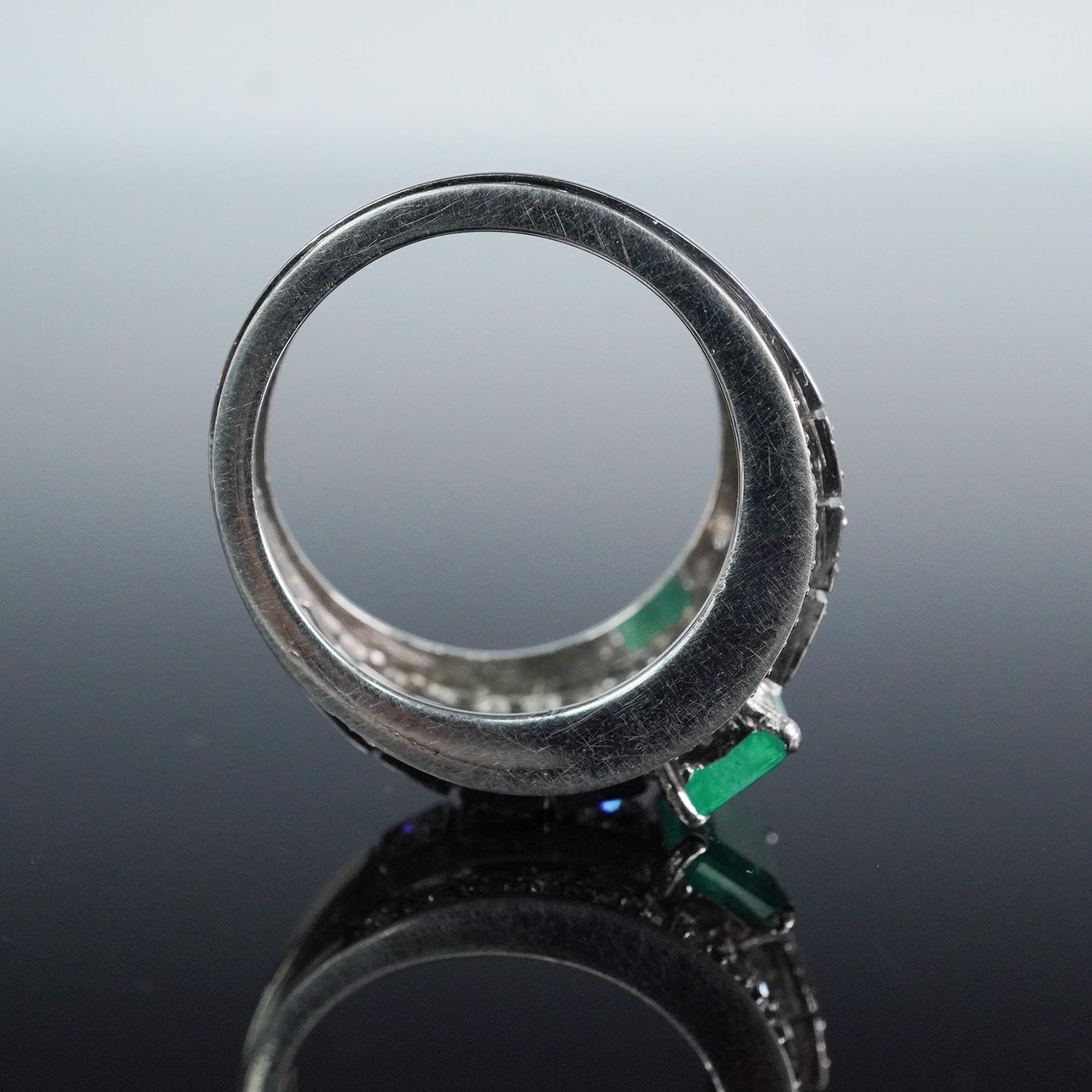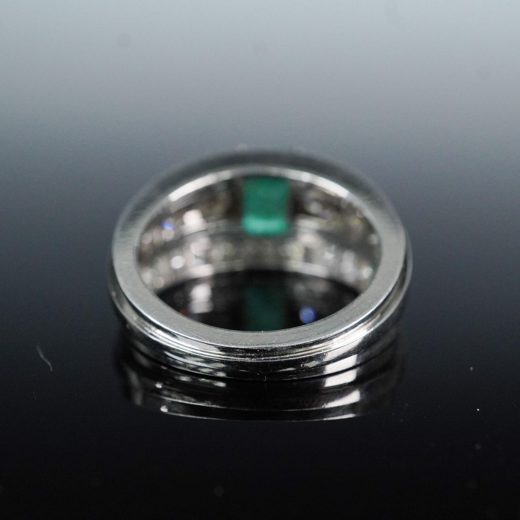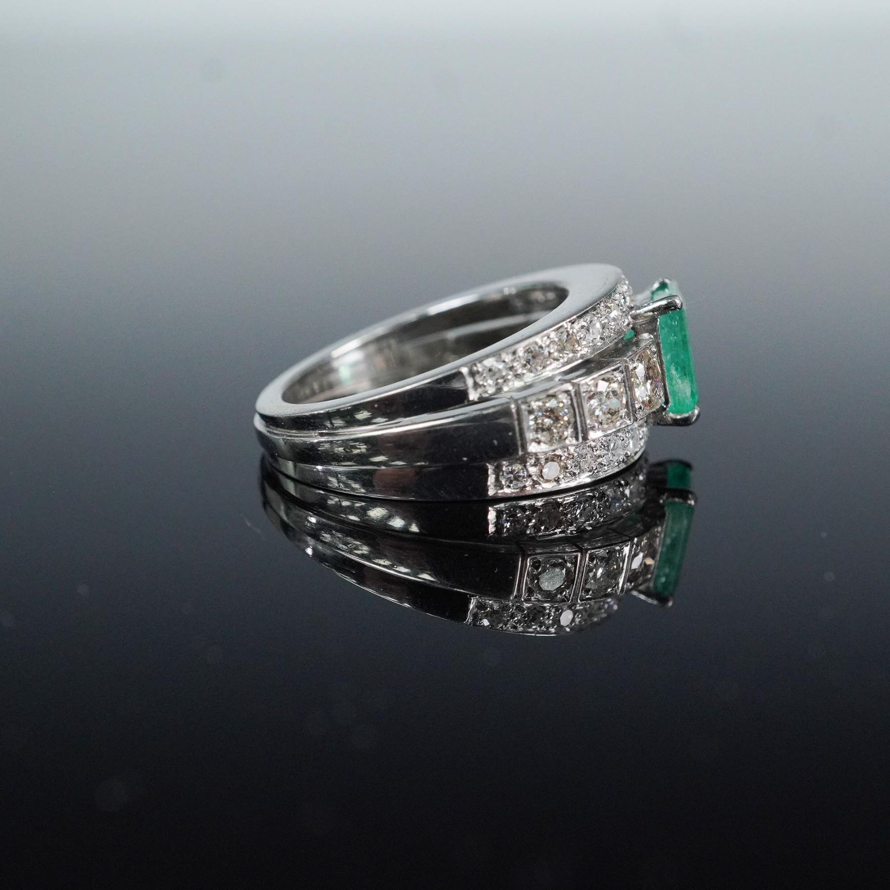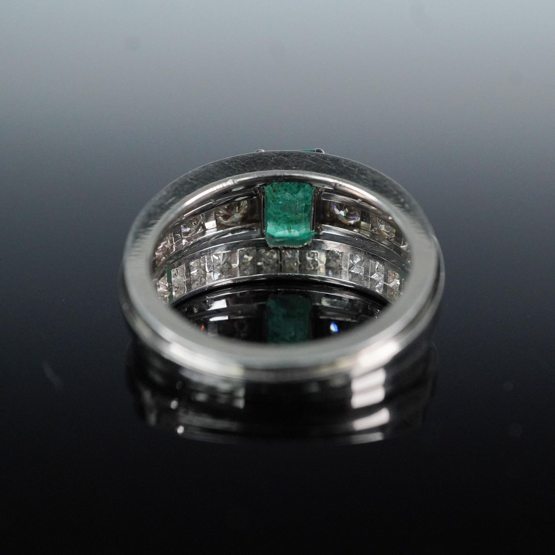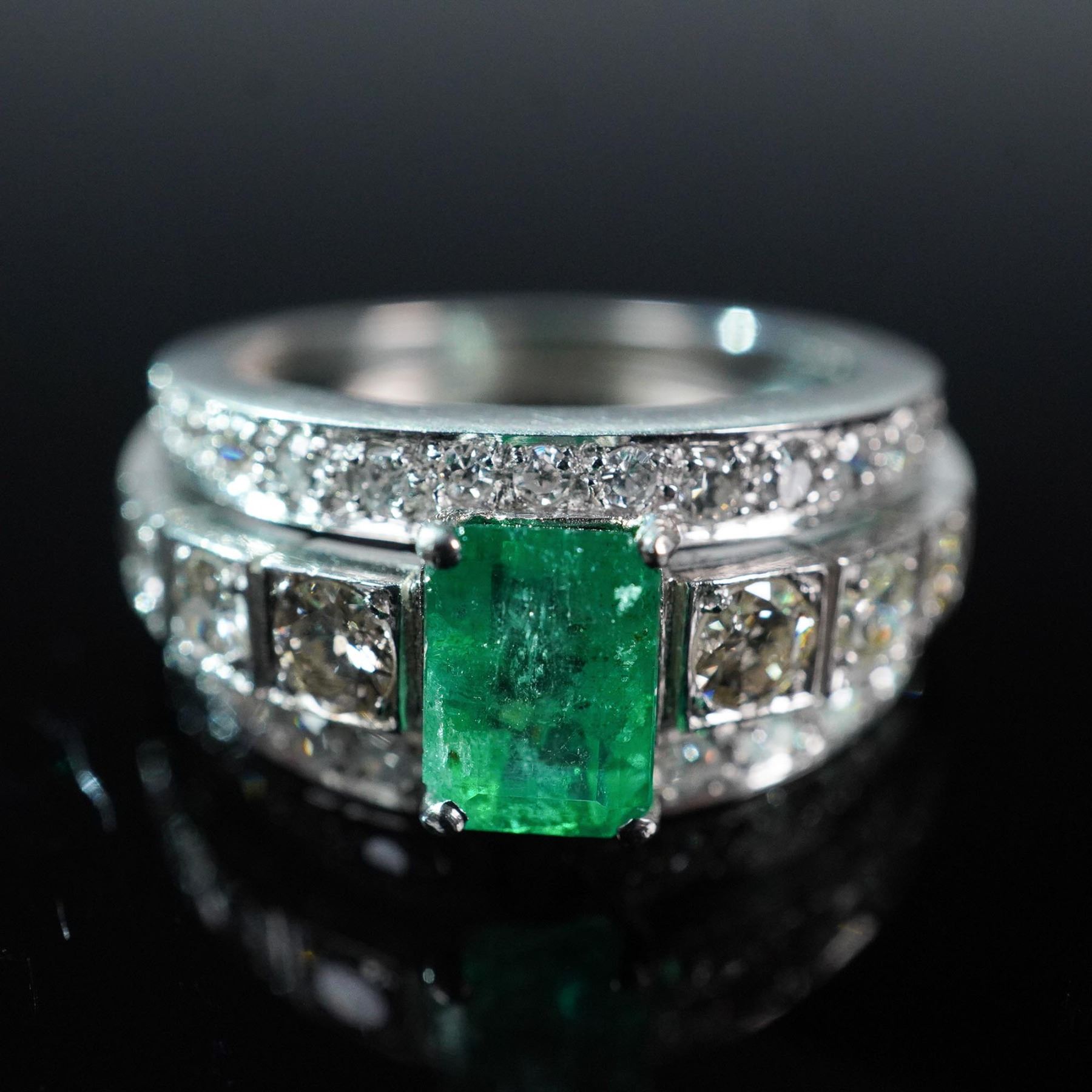 This platinum ring features a vibrant emerald measuring approximately 5.35mm x 7.42mm and weighing 1.05 carats, set in a secure prong setting. Surrounding the center stone are 32 round brilliant-cut diamonds, offering a total carat weight of approximately 1.35 carats. The setting is crafted from approximately 9.14 grams of platinum, lending the piece both durability and elegance. Ring size is US 7.