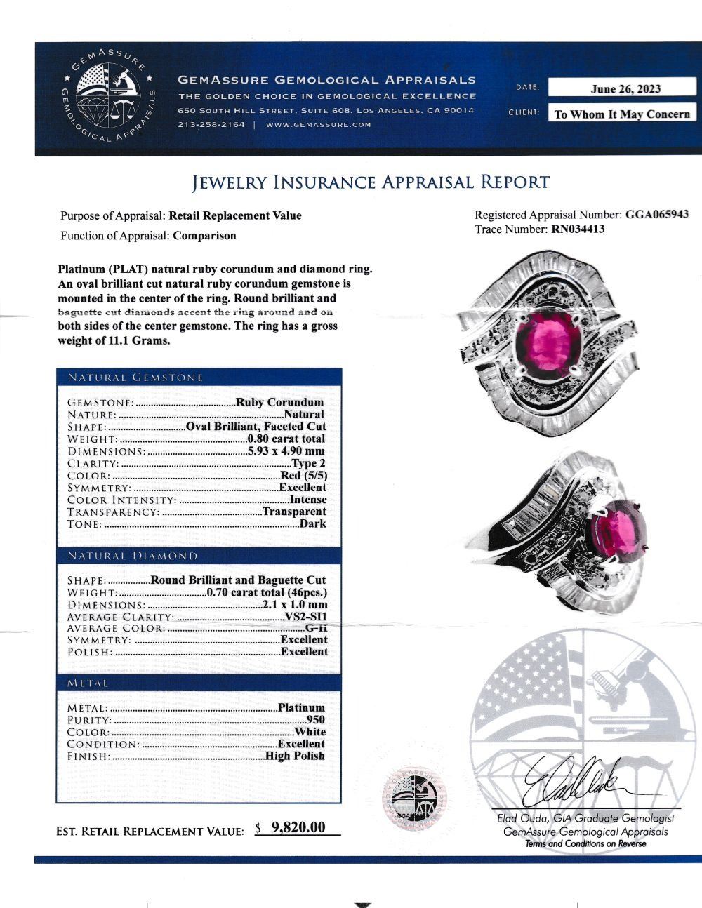 APPRAISAL DETAILS: This ring is certified and appraised for $9820.00 estimated retail replacement value by GGA.