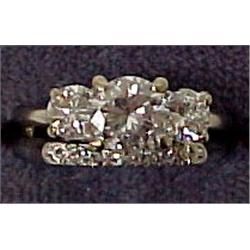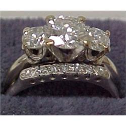 Platinum and diamond wedding set with one round brilliant cut center diamond and accent diamond on either side; center stone weighs .97 carats, color F and clarity I1; sides stones are .33 carats each, color FG and clarity SI2 and I2; three stone ring is soldered to a platinum wedding band set with five round, 1 point single cut diamonds; professional grading included