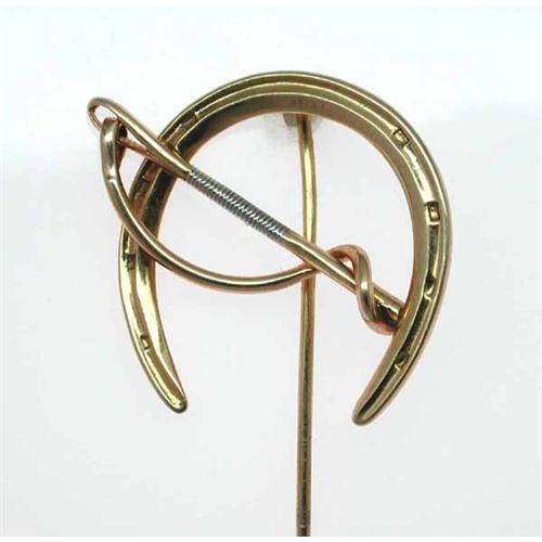 Platinum and 14Kt gold stick pin in the form of a horseshoe and crop. Delivered in gift box.