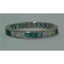 Platinum emerald and diamond band comprised of fifteen round diamonds approximately 4 points each; F color; clarity VS and 15 square cut emeralds approximately 5.3 points each; stones alternate three diamonds and three emeralds around entire band; approximate size six; weight 1.9 dwt/3.0 grams; (no visible damage)