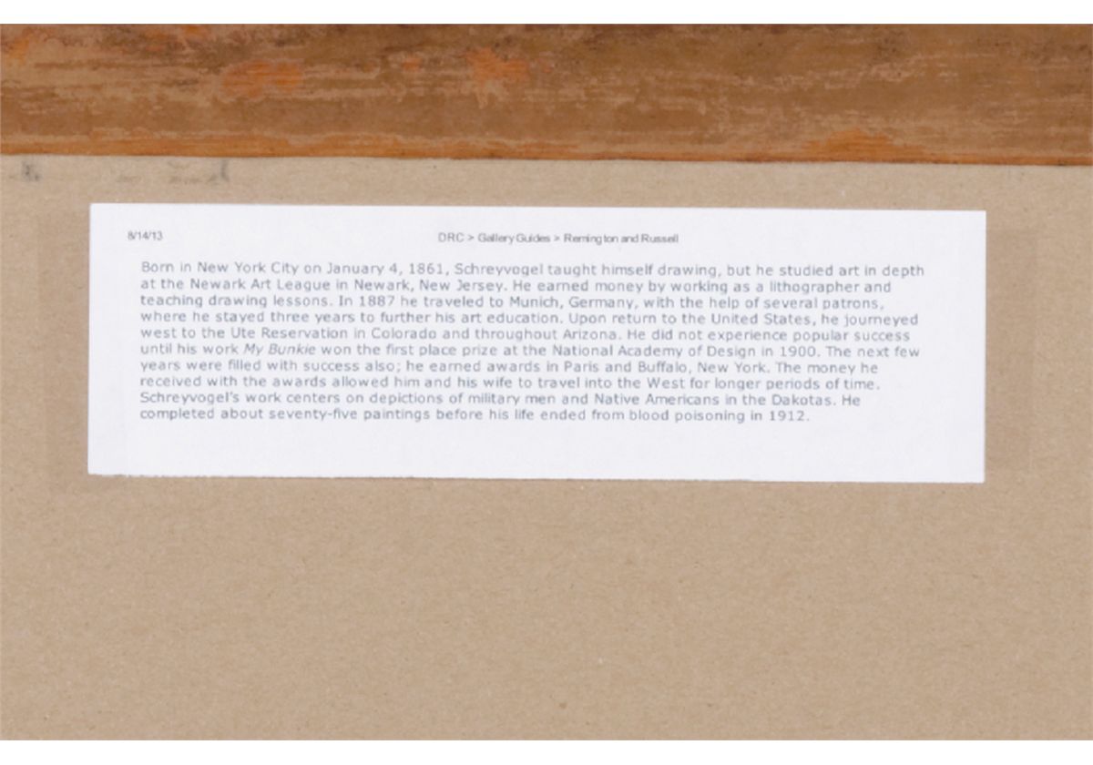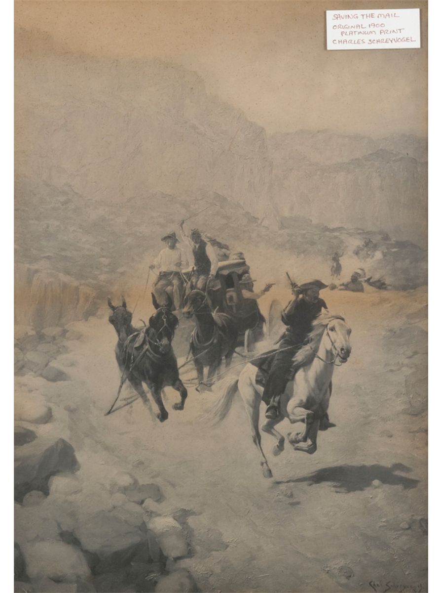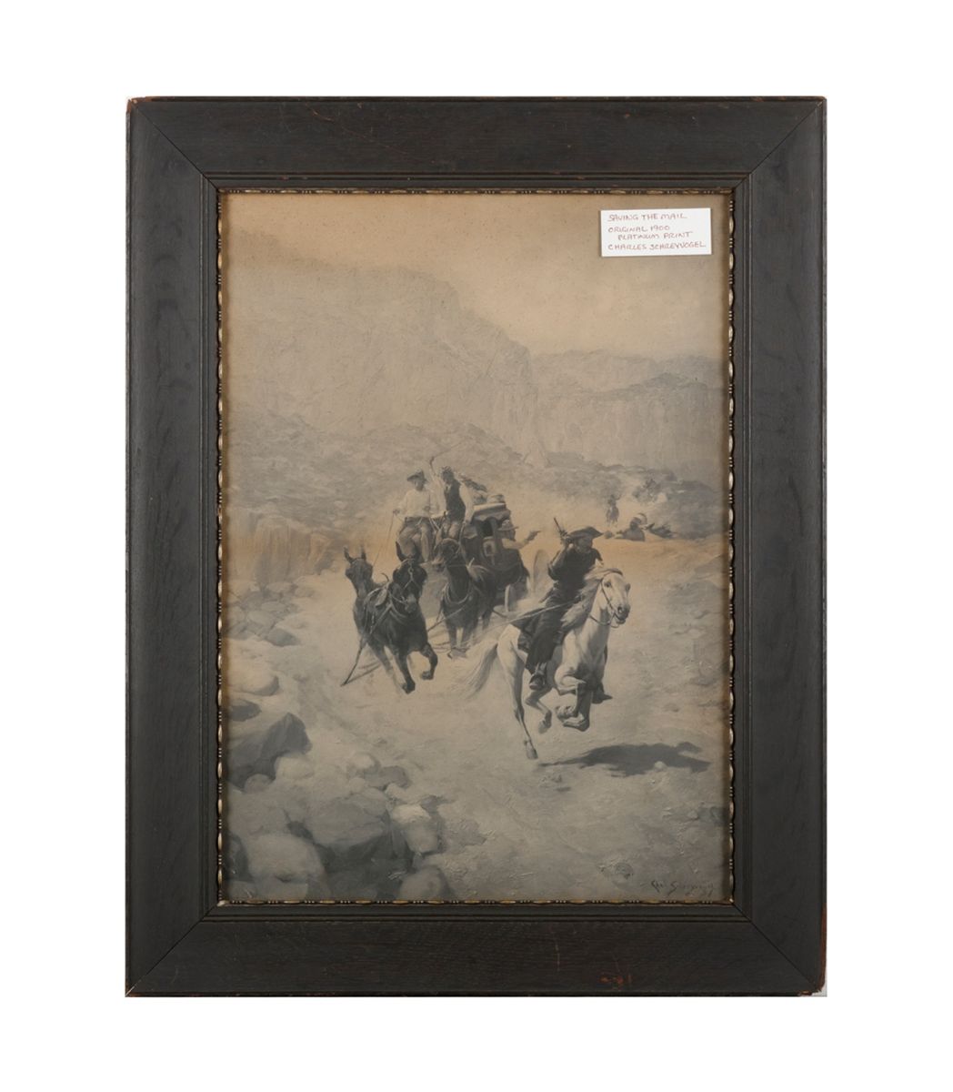 Platinum print by Charles Schreyvogel entitled “Saving The Mail” circa 1900 in old period frame. Charles Schreyvogel was in the top tier of Western artists at the turn-of-the-century and his work entitled “My Bunkie” won 1st prize at the National Academy of Design in 1900 the same year this print was issued. The print measures approximately 20” x 15” and it is in good condition showing normal aging process with some small areas of minor spotting. The print is executed in such away that it appears to have brushstrokes and looks like a gouache although it is actually a print. Est.: $1000-$2000