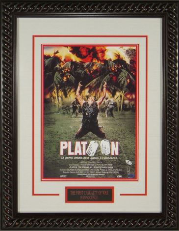 Platoon is a 1986 American war film written and directed by Oliver Stone and starring Tom Berenger, Willem Dafoe, and Charlie Sheen. It is the first film of a trilogy of Vietnam War films directed by Stone, followed by Born on the Fourth of July (1989) and Heaven & Earth (1993). Stone wrote the screenplay based upon his experiences as a U.S. infantryman in Vietnam, to counter the vision of the war portrayed in John Wayne's The Green Berets. Platoon was the first Hollywood film to be written and directed by a veteran of the Vietnam War. Platoon won the Academy Award for Best Picture of 1986; it also won Best Director for Oliver Stone, as well as Best Sound Mixing and Best Film Editing. This is an Unsigned Publicity Masterprint 11x17 inch movie poster with museum Quality Custom Rope Framed as shown to an overall size of 20x28. The perfect addition to complement any Home Theater Collection.