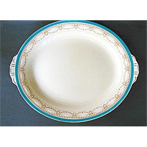 Platter in the Dunrobin pattern from Grindley China Company of England. Lovely aqua or turquoise band with tan dots and ribbons and flowers enhancement. <BR>This size platter 12.50 is difficult to find. Some wear to gold trim and matches other pieces on my site. Third photo is the 2 different platters together I have for sale. Grindley Dunrobin Turquoise.
