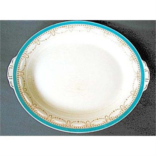 Platter in the Grindley China Dunrobin pattern. Large 14.875 this serving platter matches other pieces on my site and is the largest in this pattern. Some wear to gold but all of these pieces are marked lower than market due to glaze stress mark on bottom that does not show thru the top at all. Gorgeous aqua or turquoise band with tan dots and ribbons and flowers enhancement. Grindley Dunrobin.