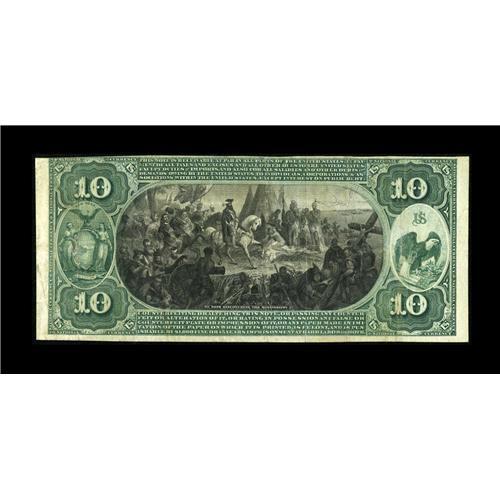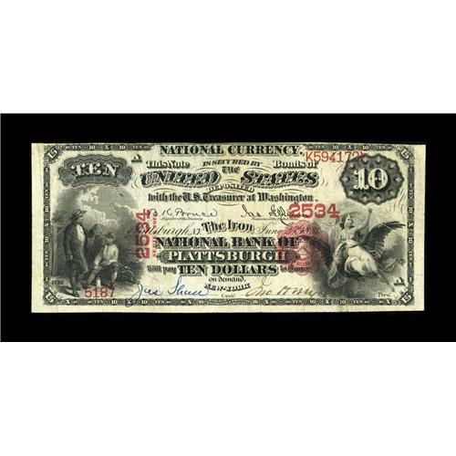 <B>Plattsburgh, NY</B></I> - $10 1875 Fr. 420 <B>The Iron NB</B></I> Ch. # 2534<BR>First Charters only from this rare bank, which liquidated at the expiration of its charter in 1901. Five notes are known, with this as nice as any. Bright <B>Very Fine+,</B></I> with two color pen signatures.<BR><BR><b>Shipping:</b> Coin/Currency (<a target="_blank" href="http://www.heritageauctions.com/common/shipping.php">view shipping information</a>)
