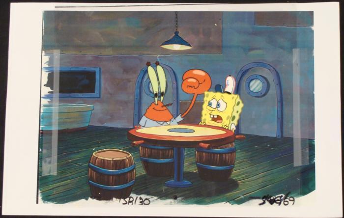 To create production cels, the original animator's drawing is transferred onto an acetate cel (by hand-inking and/or photo copying). The cel is then hand-painted on the reverse side. The background accompanying this set-up is a hand-painted original production background. The printed background is ready to be matted and framed. It is a colored background with a cel and has the animator's notations at the bottom of the background and cel. The cel has multi-layers; first is SpongeBob and the second cel is Mr. Krabs. There some slight paint fade to SpongeBob's and Mr. Krabs outlines. The background is a reproduction printed background. The cels have been taped to the background.
