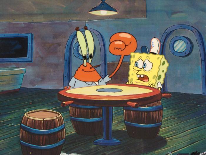 This original hand-painted background and animation cel is from the Nickelodeon TV show SpongeBob Squarepants. The story takes place under the deep blue sea in Bikini Bottom, where SpongeBob resides. SpongeBob, who is a yellow, porous sponge, is your typical happy-go-lucky character, as he is always cheerful and enjoys making people laugh. Patrick Star, SpongeBob's neighbor who is a starfish, is your average children's show idiot, as he boasts knowing nothing and is often getting himself into ridiculous situations. Between the homes of these two lies the home of the miserable Squidward, a squid, who is known for being grouchy and playing tricks on SpongeBob and Patrick. Both SpongeBob and Squidward work at the Krusty Krab, a fast food business run by the greedy money-loving Mr. Krabs, a crab, the arch rival of the evil, possibly misunderstood, Plankton. Another neighbor, Sandy Cheeks, an athletic squirrel who normally wears an astronaut's space suit, was introduced in "Tea at the Treedome." She spends most of her time inventing and experimenting. SpongeBob dosen't want to play the game anymore.Original Production Background and Animated Cel Overall Size of Background: 11" x 17" Overall Size of the Cels: 10 1/2" x 12 1/2" Very good condition; it has been stored This is an original hand-painted cel set-up used in the production of an episode of "SpongeBob SquarePants." Each one-of-a-kind set-up represents a slight change in position of the characters. When individually photographed and projected in rapid succession, the images appear to move.