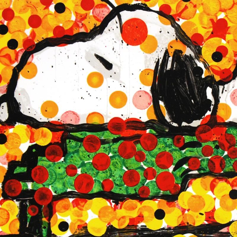 Master Artist Tom Everhart is the protege of famed "Peanuts" creator, Charles M. Schulz (1922-2000). As the only artist in the world granted the rights to draw the "Peanuts" characters in his own work, Everhart creates vibrant, extremely collectible rainbow masterpieces featuring Snoopy, Woodstock and the gang. "Play that Funky Music" is a limited edition hand pulled original lithograph on museum quality deckle-edge paper, numbered and hand signed by Everhart! Includes certificate of authenticity! Measures approx. 34" x 27.5" (with border); 30" x 22.5" (image). This artwork was created on one of two rare antique Marinoni Voirin lithograph presses that date back to the 1800's, and are reputed to come from the Paris print shop used by Henri Toulouse-Lautrec. There are only 7 of these magnificent beasts left in the world: the smaller one (with a print bed size of 25" x 35"), weighs 9 tons, and the larger one weighs in at 11 tons (print bed size 31" x 47"). The significance of this is that the lithographs produced by this method are of the finest quality, using techniques that are so labor and time intensive that very few master printers know how to operate and care for these presses today. Each lithograph is created with hand-mixed colors applied one at a time - a highly trained and synchronized team must hand feed each museum-quality sheet of paper through the press numerous times in order to set the colors and impressions, while the Chromist - a trained color specialist - adjusts each color by look and feel to match the original artwork, as if mixing a potion. The result is an image with maximum pigment saturation, formed through rich layers of color that imbue the artwork with a permanency of brilliance - proven over centuries to last. In contrast, today's printers use a method more akin to a dot matrix style application, with the colors all premixed and sprayed onto a sheet in a uniform layer, resulting in a much less saturated image that is susceptible to fading and imperfect color reproduction. This is one of the final Tom Everhart editions to be printed using this very special technique.