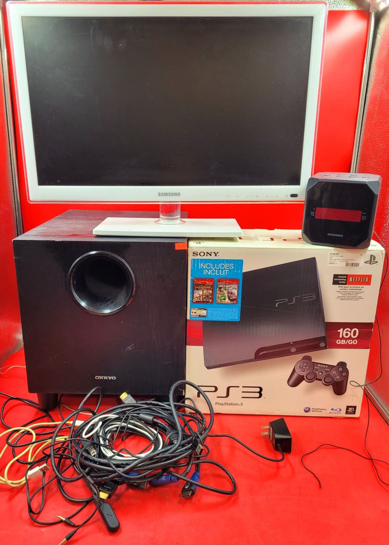 PlayStation 3 Console w/ Controller, Onkyo Speaker, Samsung Monitor, & Sylvania Alarm Clock