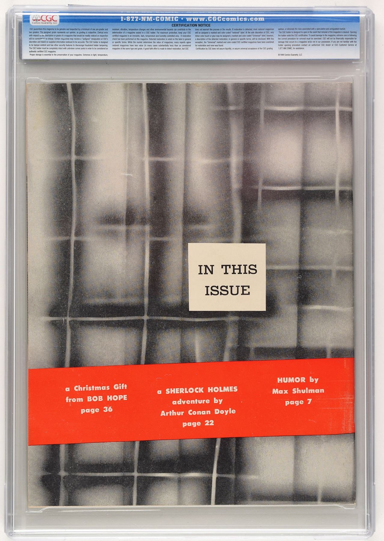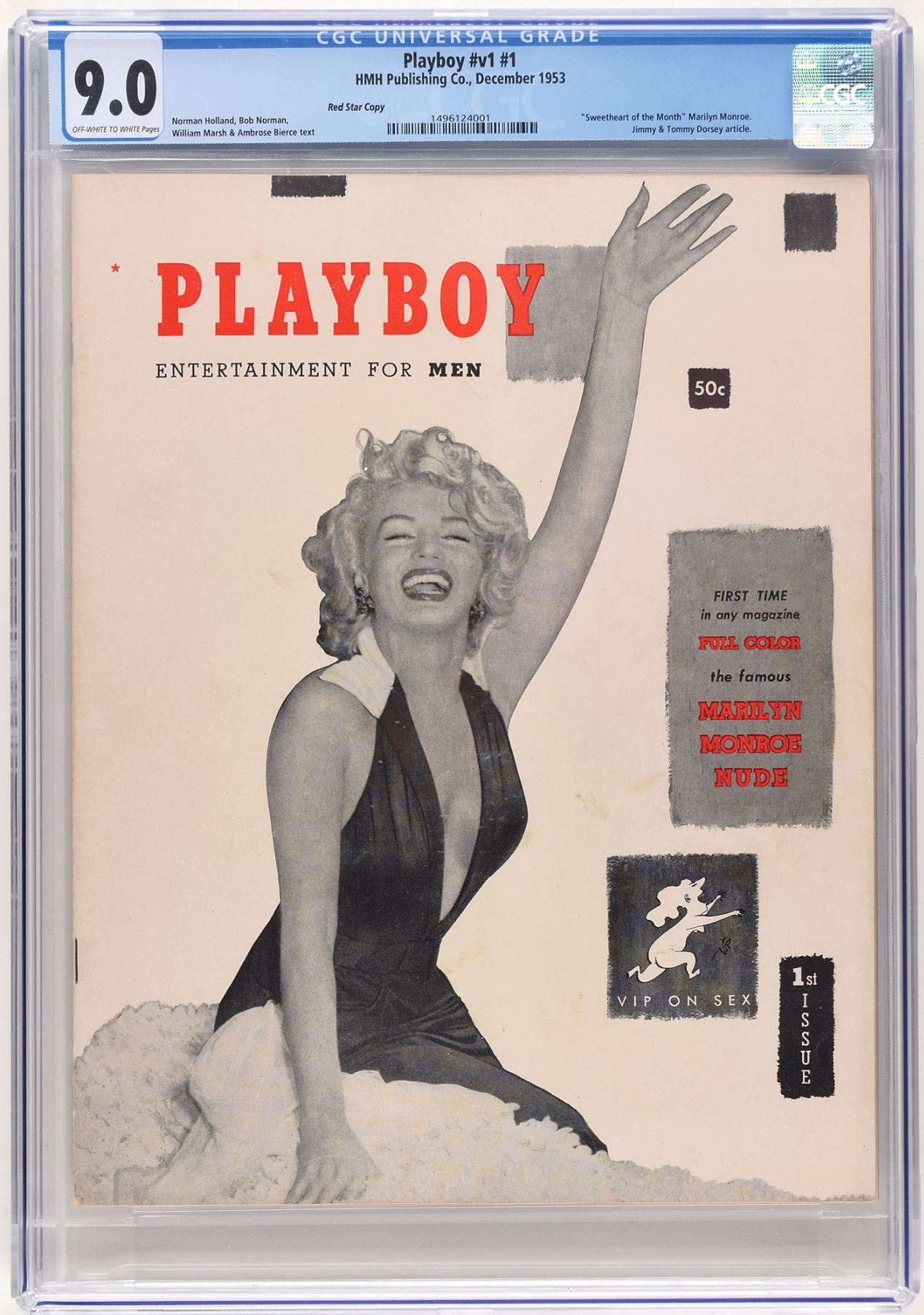 Playboy #1 'Red Star Copy' (HMH Publishing Co., December 1953) - CGC Universal Grade 9.0 - off-white to white pages - featuring Marilyn Monroe on the front cover and inside. This iconic magazine, which famously features a full-color nude of Miss Monroe (the one and only "Sweetheart of the Month") as the centerfold, launched Hugh Hefner's Playboy into the national spotlight as America's leading magazine for men's entertainment. This 'red star' version—one of three variants of the issue—is distinguished by the small red star on the cover, to the left of the title; the others, a newsstand edition and a 'Page 3' version with the third page numbered, are considered more common. The CGC census reveals the 'Red Star Copy' as the rarest variant: of the 319 Playboy #1s evaluated by CGC, only 22 have been the 'Red Star Copy.' Of these 22, just two have been graded as 9.0, with one higher.