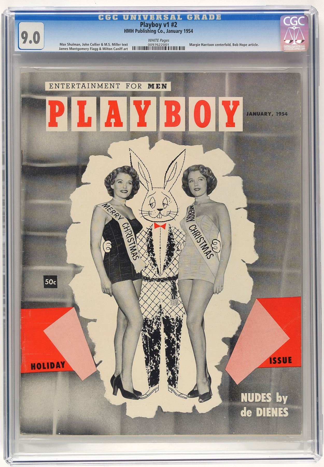 Playboy #2 (HMH Publishing Co., January 1954) - CGC Universal Grade 9.0 - white pages - featuring Margie Harrison on the front cover and inside as the very first "Playmate of the Month." The CGC census records just nine examples at this grade or higher (the highest graded is 9.2, just one increment higher). Playboy #2 is widely considered to be the scarcest of any Playboy magazine—the print run was much smaller than later issues, as Hefner was unsure of how successful the magazine would be, and it appears at auction far less frequently than the first issue. High-grade examples of this issue are extremely difficult to find.