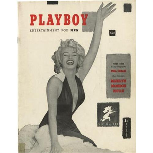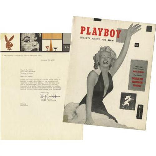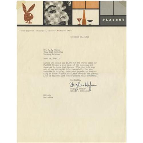 <B><I>Playboy</B></I></B></I> <B>First Issue With a Letter Signed By Hugh M. Hefner.</B></I> A nice copy of the first issue of <I>Playboy</B></I> is cause enough for excitement, but this offering is also accompanied by a personal letter from founder Hugh Hefner! Having missed the first issue, early collector John Basil wrote to Hugh Hefner, offering $5 for the 50-cent premiere issue. To Mr. Basil's delight, Hef personally responded on November 21, 1955 with a warm letter that stated, "Anyone who would pay $5.00 for the first issue of <I>Playboy</B></I> thinks a good deal of the magazine and deserves to have that issue. I've dug this copy out of our editorial file, especially for you. Consider it a gift." The letter was typed by Janet Pilgrim, a longtime employee of Hefner, and a three-time Playmate of the Month. As Subscription Manager, Ms. Pilgrim personally phoned Mr. Basil later to personally congratulate him when he joined the Lifetime Playboy Club (see following lot).<BR><BR>Hefner's letter was folded and affixed onto the first page of the issue, and the tape holding the letter in place can still be seen. Tape remnants can also be seen at the top corners of the letter. Page 3 of this copy is numbered, unlike the majority of copies of the premiere issue. Overall, the magazine is in Fine condition with a small piece of tape at the bottom of the magazine's spine and some minor staining along the bottom edge of the front cover, which does not extend inside. With the personal letter from Hefner, this copy of the prized first issue becomes truly unique! <I>Accompanied by a COA from PSA/DNA.</B></I><B>Condition Report:</B> Normal signs of wear as appropriate with age. Fine condition with tape at lower left corner (no indication of rip.) There is minor staining at lower front edge, which does not go through to the inside cover.<BR><BR><b>Shipping:</b> Books & Catalogs (<a target="_blank" href="http://www.heritageauctions.com/common/shipping.php">view shipping information</a>)