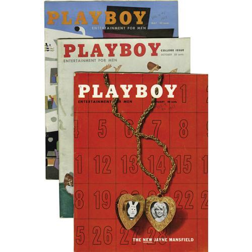 <B>Playboy Group (HMH Publishing, 1954-61) Condition: Average FN/VF.</B></I> Here's a ready-made early <B>Playboy</B></I> collection to fill your gaps or get you started. Included are copies from September and October, 1955; all of 1956, except the November issue; January, February, May, July, and November, 1957; January, November, and December, 1958; January, February, March, May, October, November, and December, 1959; January, June, July, August, and November, 1960; and all of 1961, except the June copy, including 2 copies of the February issue. <BR><BR>There are contributions from Steve Allen, Ray Bradbury, Erkskine Caldwell, Jules Feiffer, Ralph Ginsberg, Herbert Gold, Jack Kerouac, W. Somerset Maugham, Shel Silverstein, Gahan Wilson... and, cutting to the chase, pictorials of Marilyn Monroe, Jayne Mansfield, Anita Ekberg, Diana Dors, Tina Louise, Sophia Loren, Brigitte Bardot, Kim Novak, June Wilkinson, and others; classic Playmates Janet Pilgrim, Lisa Winters, Joyce Nizzari, Ellan Stratton, Stella Stevens, and Christa Speck; and Playmate reviews in all the December issues.<BR><BR>Unfortunately the centerfolds from 9/55, 6/56, and 1/58 are missing; a coupon has been cut from the 12/56 issue; and the 3/59 issue has two tape tears on the front cover, so...tell you what - we'll include copies of the two hard-to-find hardbacks, <B>The Best From Playboy</B></I> (1954) and <B>Playboy Annual</B></I> #1 (1955). Entertainment for Men, indeed! Approximate value of group from The Confident Collector's <B>Collectible Magazines Identification and Price Guide</B></I> = $1,300. <BR><BR><B>Important notice:</B> Heritage usually auctions material at the rate of 200-250 lots per hour. On some occasions eBay Live bid software or the Internet may not be able to keep up with the pace of the auction. We recommend placing a realistic absentee bid now as insurance to avoid disappointment. Occasionally the auctioneer may eliminate or reject an eBay Live bid, and the auctioneer may also reopen a lot after the close of the eBay live bidding (usually because we missed an audience bid), and may reject your bid even if it shows you as the winning bidder. By bidding via eBay Live, you agree that Heritage may award the lot to another bidder at its sole discretion under the circumstances described above or any other reasonable circumstances. Since eBay bids are not shown to us until we open the lot on the floor, we treat those bids just like floor bids. In most cases the floor responds before the eBay bid is presented to us, due to Internet lag time, so for consistency we have made it a policy that floor bids are always considered first over tie eBay live bids. Also please note that all Heritage lots purchased through eBay Live carry a 22.5% Buyer's Premium. Please make sure you read the Terms and Conditions before you bid. This lot is being auctioned in conjunction with a live floor auction by Heritage Auction Galleries. All final auction and invoice information will be supplied by Heritage Auction Galleries, and all other information should be considered preliminary. Lot:41001 <BR><BR><B>Winning Notification and Billing:</B> After the FINAL session in this auction is complete, Heritage will send e-mail and snail mail invoices. This process normally takes several days. All final auction and invoice information will be supplied by Heritage Auction Galleries, and all other information should be considered preliminary. <BR><BR>This auction will be conducted on a live auction floor and over the Internet through eBay Live. If you choose to place an absentee bid, please take a moment to <font color='#0000ff'><u><a href='http://pages.ebay.com/liveauctions/help/before/laabsentee.html'>learn how eBay Live absentee bidding works</a></u></font><font color='#000000'>