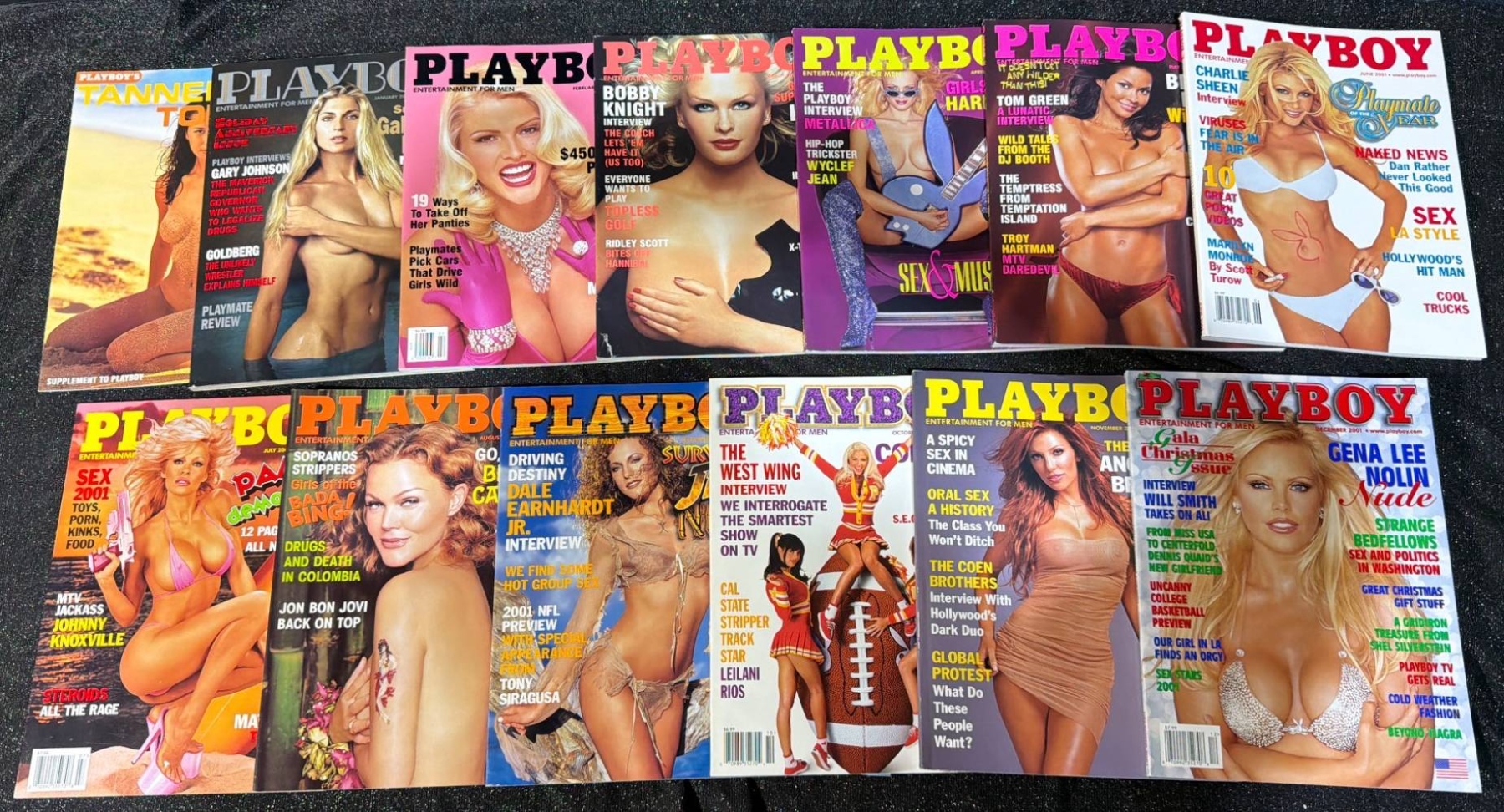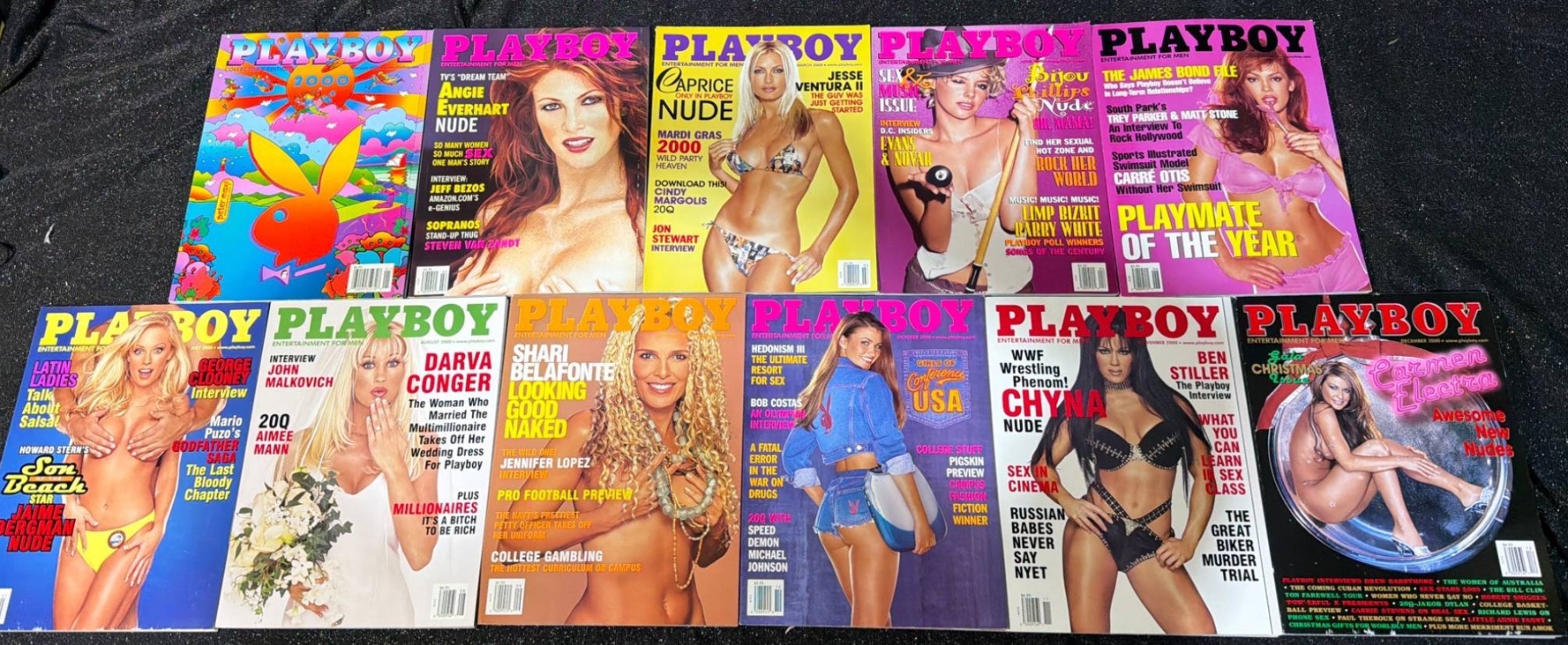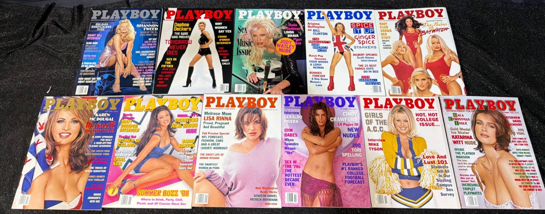 Approximately 48 Playboy magazines ranging from 1998 to 2001. Covers feature notable models and celebrities, with vibrant cover art typical of the era. Magazines are stored neatly, suggesting well-preserved condition. Dimensions of each magazine are approximately 8.25 in x 11 in. Ideal for collectors or enthusiasts of iconic pop culture publications. Additional condition details available upon request.