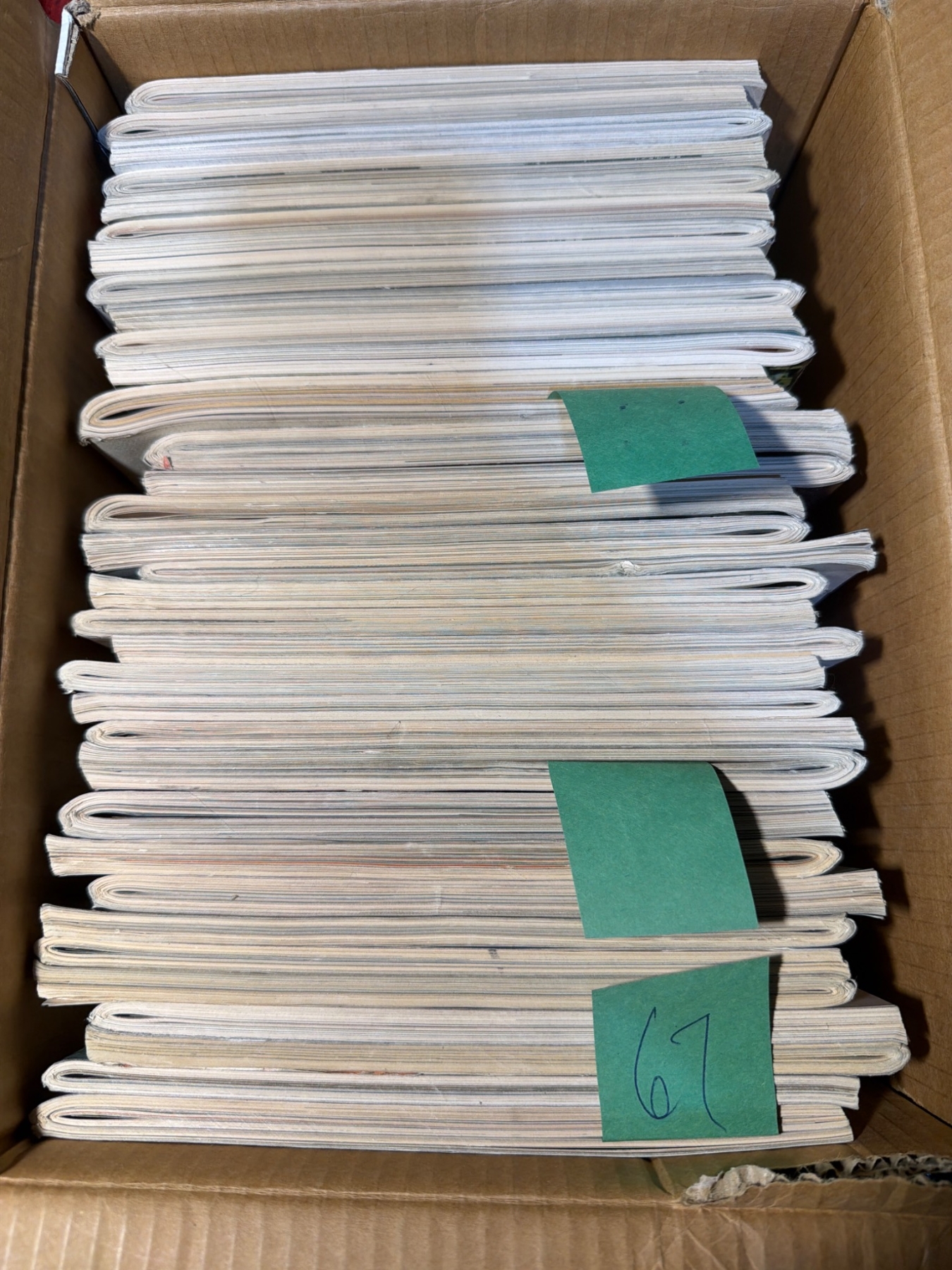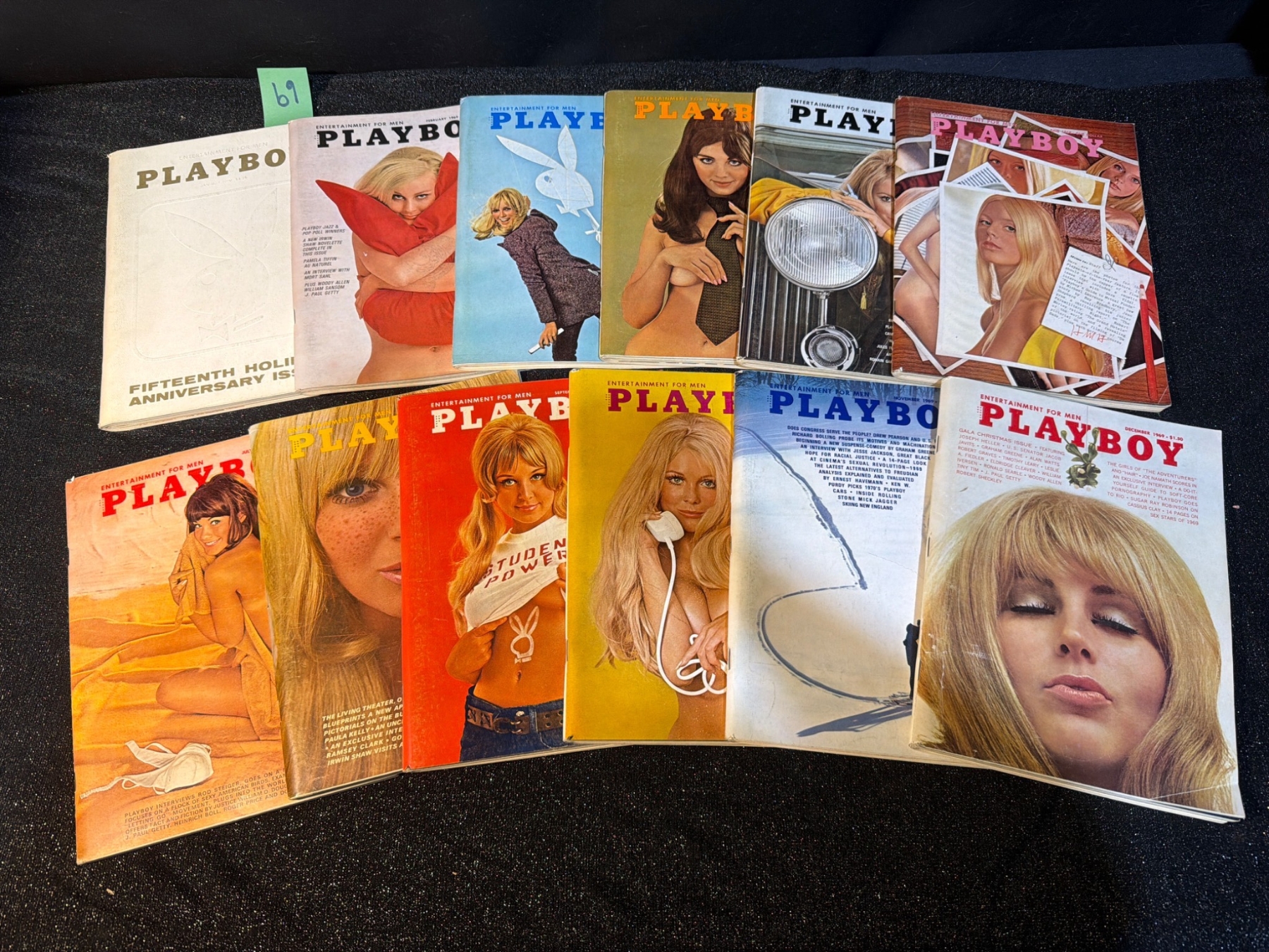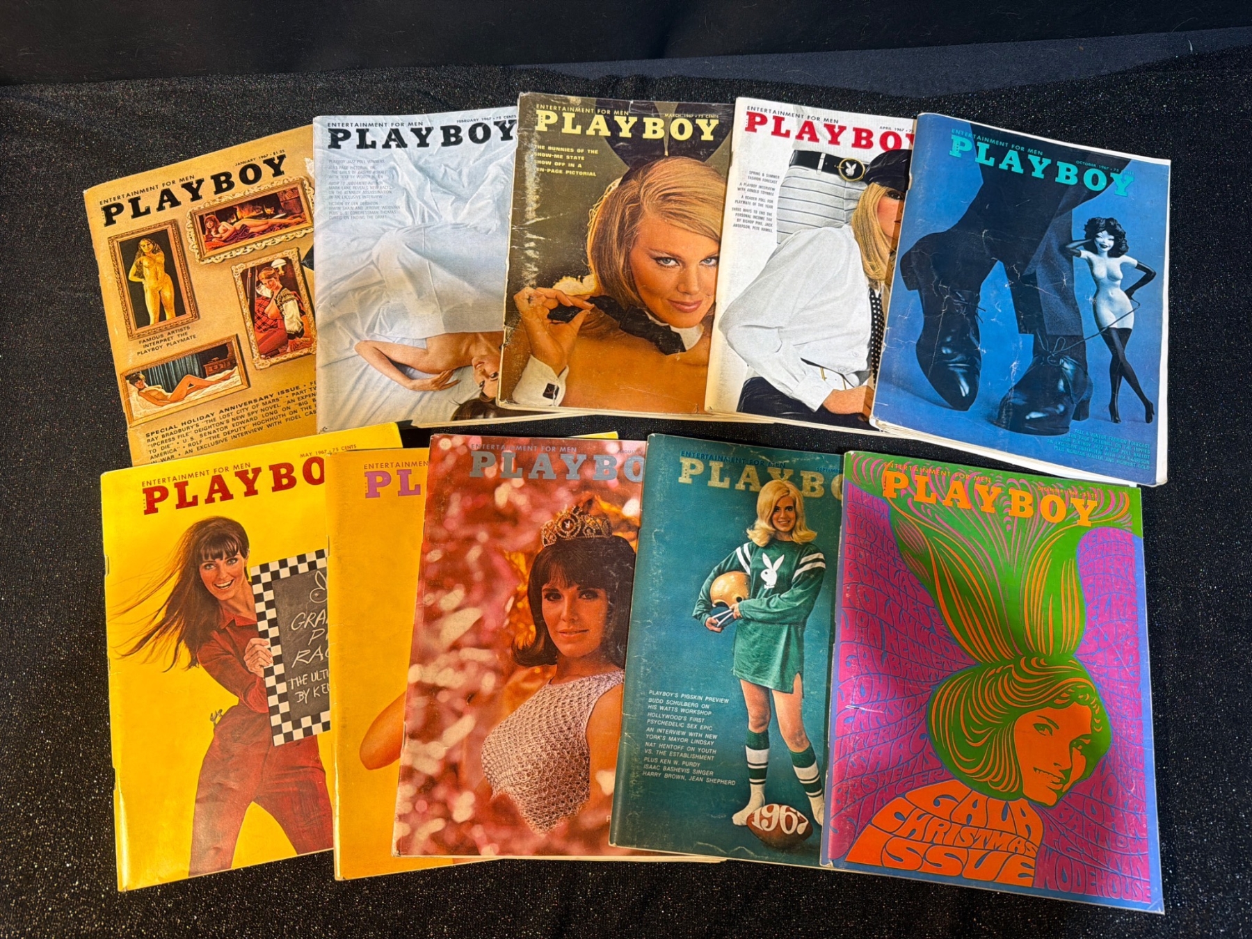 Playboy magazines featuring editions published between 1967 and 1969. Includes a range of issues displaying vibrant covers and iconic imagery indicative of Playboy's classic era. These magazines are in previously used condition and are stored flat as shown. Ideal for collectors or enthusiasts of mid-century pop culture and vintage publishing.